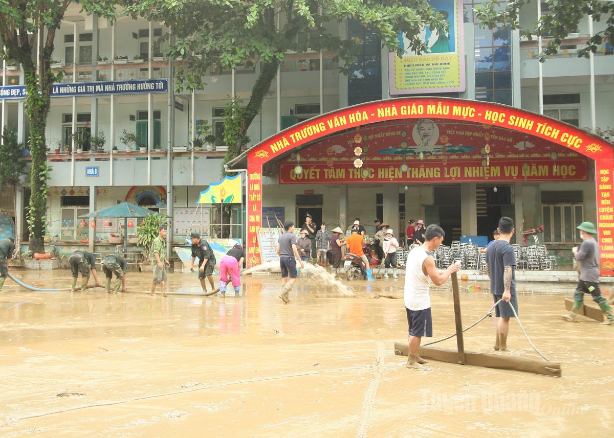 No município de Ngoc Duong, foram afetados 1 Jardim de Infância Ban Bo, um Jardim de Infância Yen Dinh, um Jardim de Infância Ngoc Duong e uma Escola Primária Ngoc Duong. Com o lema "onde a água recua, há higiene", as forças de apoio, professores e pais estão se concentrando na limpeza do pátio da escola, salas de aula, remoção de lama, limpeza de esgotos, coleta de lixo e limpeza do terreno da escola. Para o Jardim de Infância Ban Bo, cujos muros e terrenos desabaram, a escola providenciará um local temporário para estudo até que os reparos sejam concluídos, garantindo total segurança aos alunos.