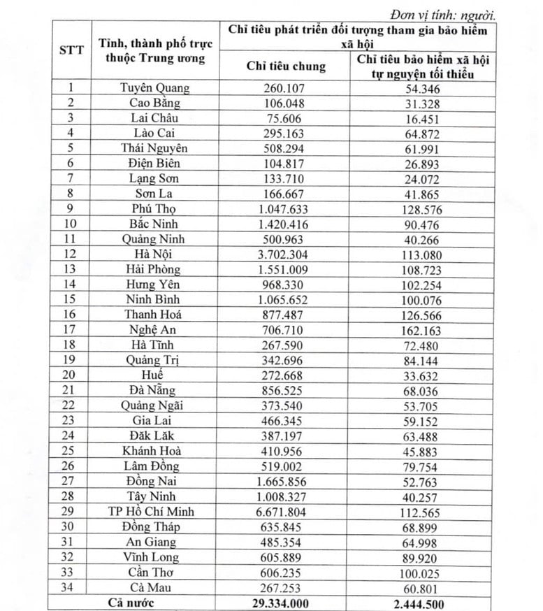 Os Comitês Populares das províncias e cidades administradas centralmente devem elaborar anualmente metas para o desenvolvimento da participação nos sistemas de previdência social obrigatória e voluntária, dentro de seus planos de desenvolvimento socioeconômico, submetendo-as aos Conselhos Populares do mesmo nível para consideração e promulgação; garantindo que, até 2030, o número de participantes na previdência social não seja inferior à meta estabelecida. O Presidente do Comitê Popular da província ou cidade administrada centralmente é responsável por dirigir e organizar a implementação e responde perante o Governo, o Primeiro-Ministro e os Conselhos Populares do mesmo nível pelo cumprimento das metas de desenvolvimento da participação na previdência social em suas respectivas áreas.