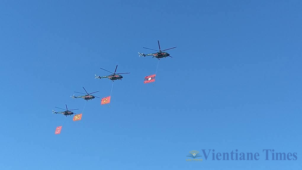Helicópteros carregando a bandeira nacional do Laos no céu - Foto: VIENTIANE TIMES