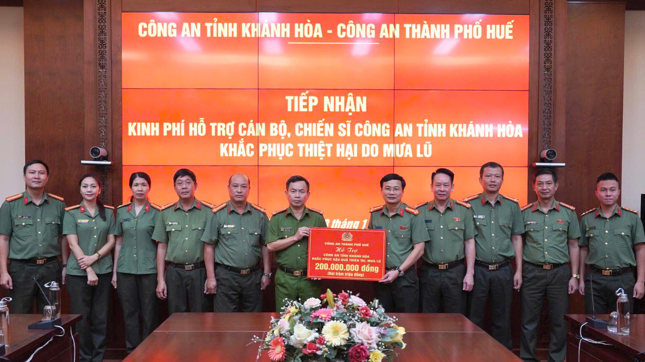 Em nome do Comitê do Partido e do Conselho de Administração da Polícia da Cidade de Hue , o Coronel Duong Van Thoan expressou sua profunda compreensão e solidariedade pelas dificuldades enfrentadas pela polícia e pela população da província de Khanh Hoa. A delegação doou 200 milhões de VND para auxiliar a Polícia Provincial de Khanh Hoa a superar rapidamente as dificuldades, estabilizar o trabalho, continuar garantindo a segurança e a ordem e apoiar a população no período de recuperação após os desastres naturais.