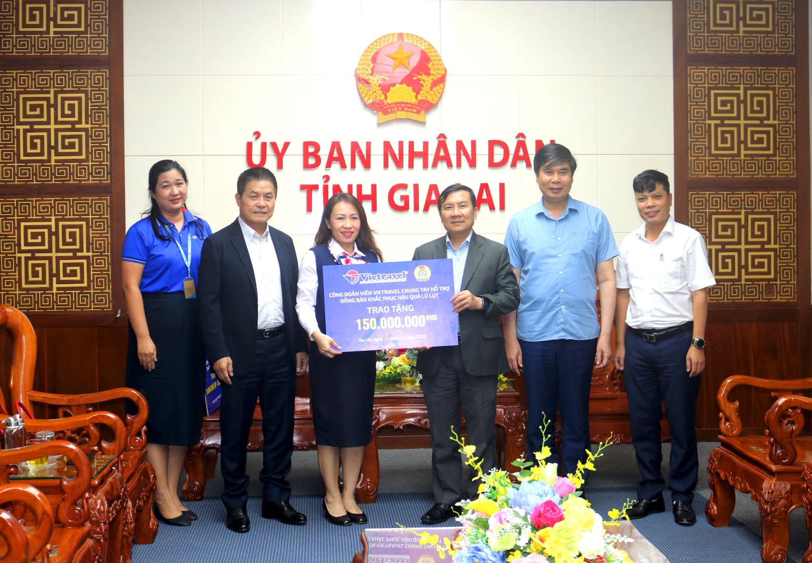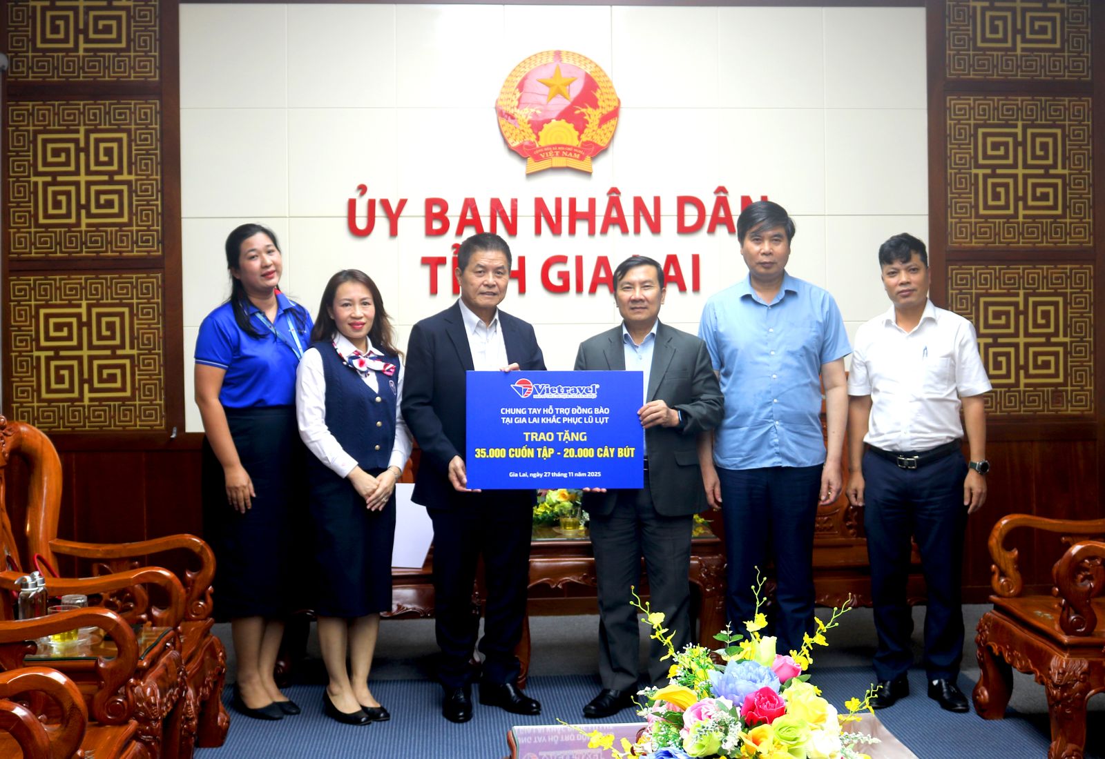Na recepção, o Sr. Nguyen Quoc Ky, Presidente do Conselho de Administração da Vietravel Tourism Joint Stock Company, entregou 35 mil cadernos e 20 mil canetas, e o representante sindical da empresa entregou 150 milhões de VND ao Departamento de Educação e Treinamento da província de Gia Lai.