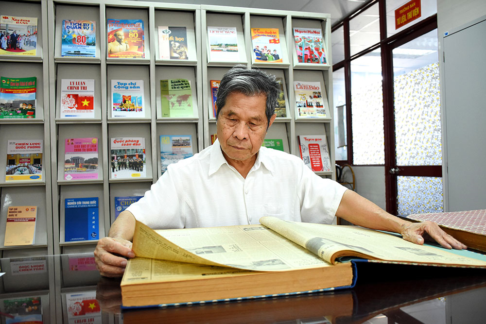 O jornalista Nguyen The Nghiep lê artigos sobre o Laos publicados no Jornal do Exército Popular. Foto: VU DUY |