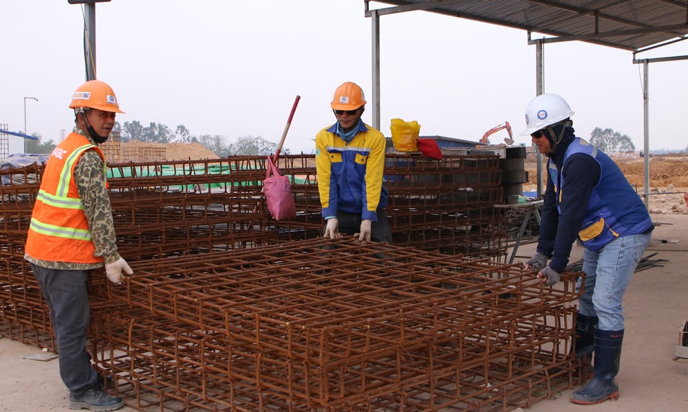 O investimento total no projeto é de quase 685 bilhões de VND (incluindo capital do investidor e capital mobilizado). O prazo de operação do projeto é de 50 anos. A construção está a cargo da Vina E&C Investment and Construction Joint Stock Company. Foto: Operários soldando painéis de malha de aço. |