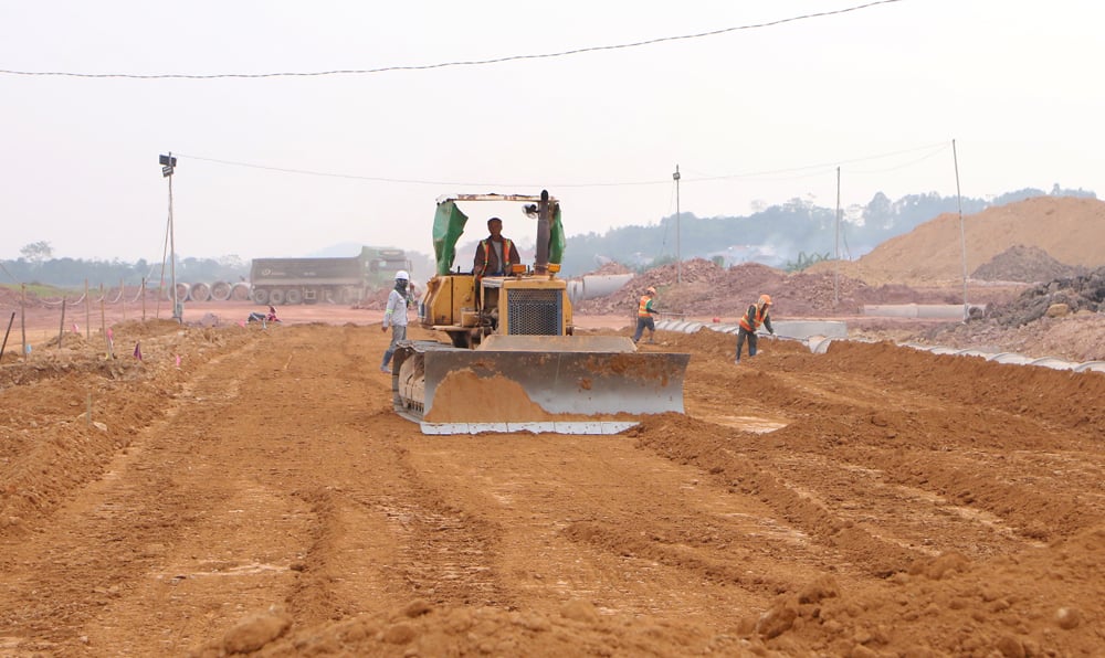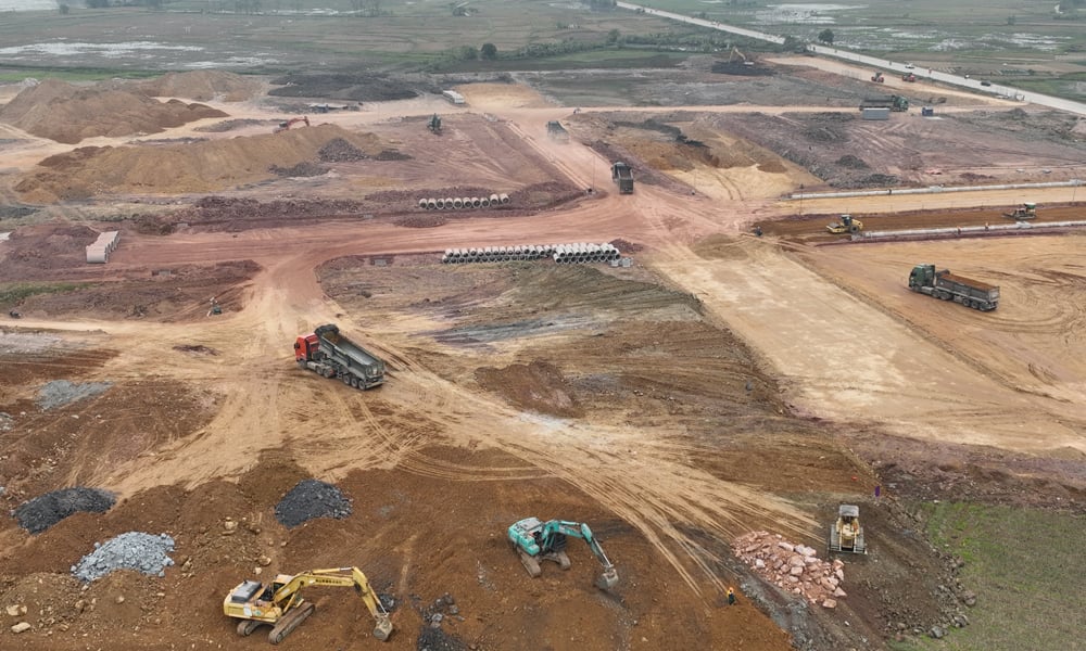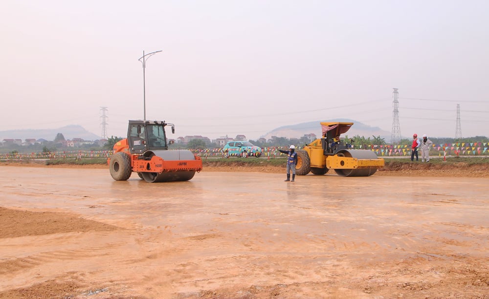 O Polo Industrial Trung Son - Ninh Son abrange uma área de 75 hectares e está sendo construído no bairro de Van Ha. A construção começou em setembro de 2025, com a joint venture 559 Construction Investment Joint Stock Company e Ban Mai Limited Liability Company como investidoras. Foto: Trabalho de nivelamento do terreno. |