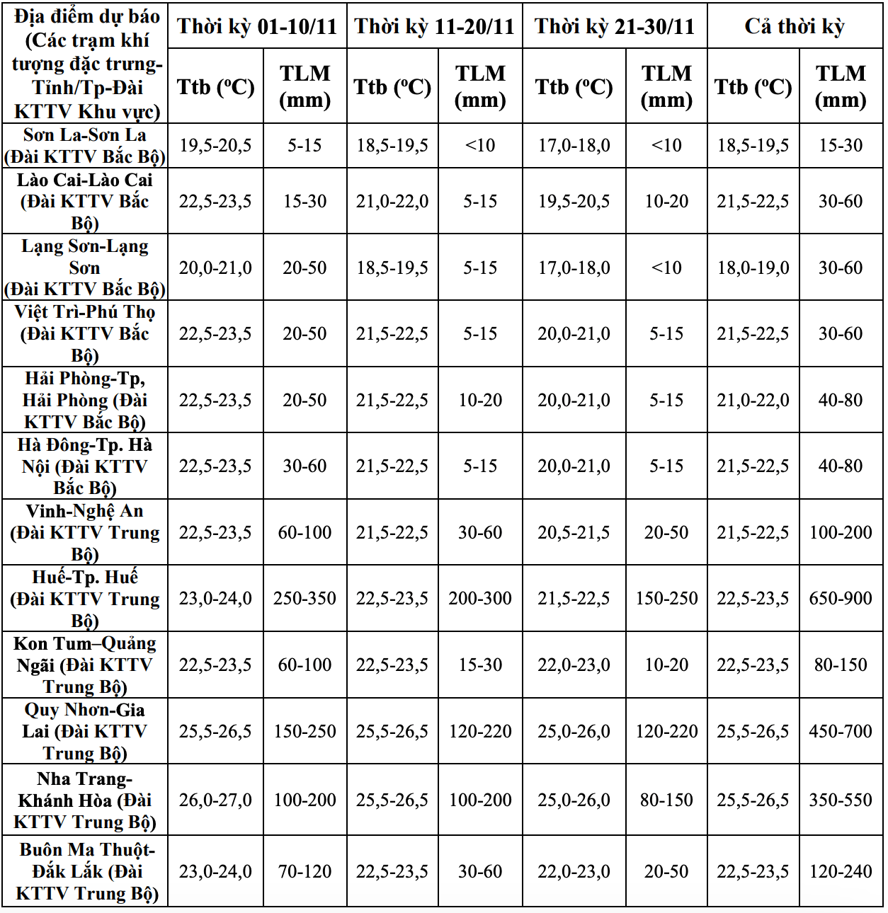 Os dados analíticos da agência meteorológica também mostram que, em novembro, a precipitação total nas regiões Norte, Thanh Hoa e Sul é geralmente semelhante à média de muitos anos, com a região Noroeste apresentando valores 10 a 30% inferiores à média de muitos anos. As demais regiões do país apresentam precipitação total geralmente 10 a 25% superior à média de muitos anos, sendo que a região Sul, de Quang Tri a Dak Lak, provavelmente terá precipitação total superior à média de muitos anos no mesmo período.