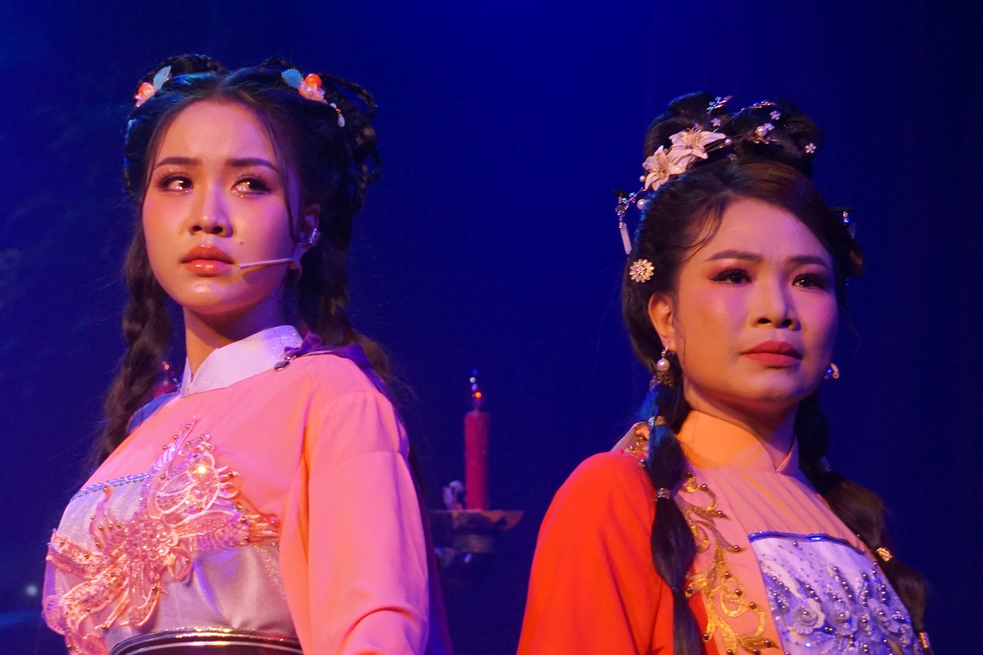A artista Nha Thy e Minh Truong na peça "Carregando Grama do Rio Han"