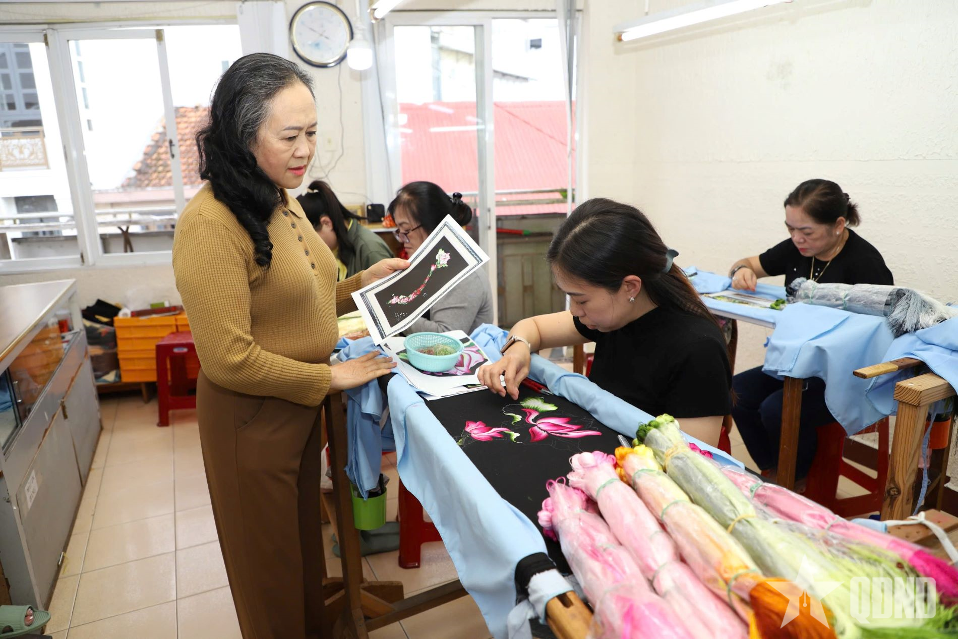 | A artesã Huu Hanh está transmitindo suas habilidades de bordado para suas aprendizes. |