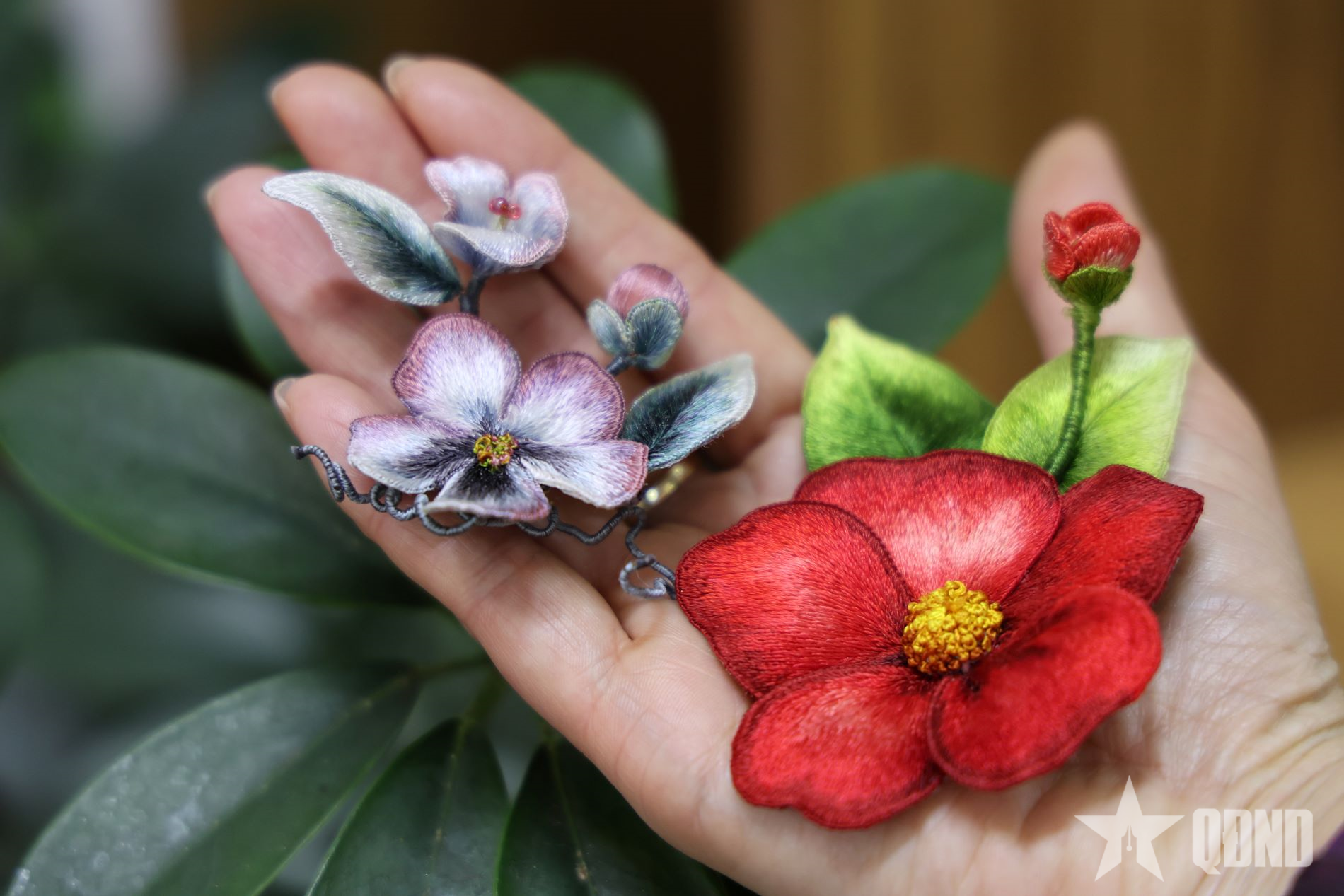 | Essas flores só "desabrocham" nas mãos da artesã Huu Hanh, que borda. |