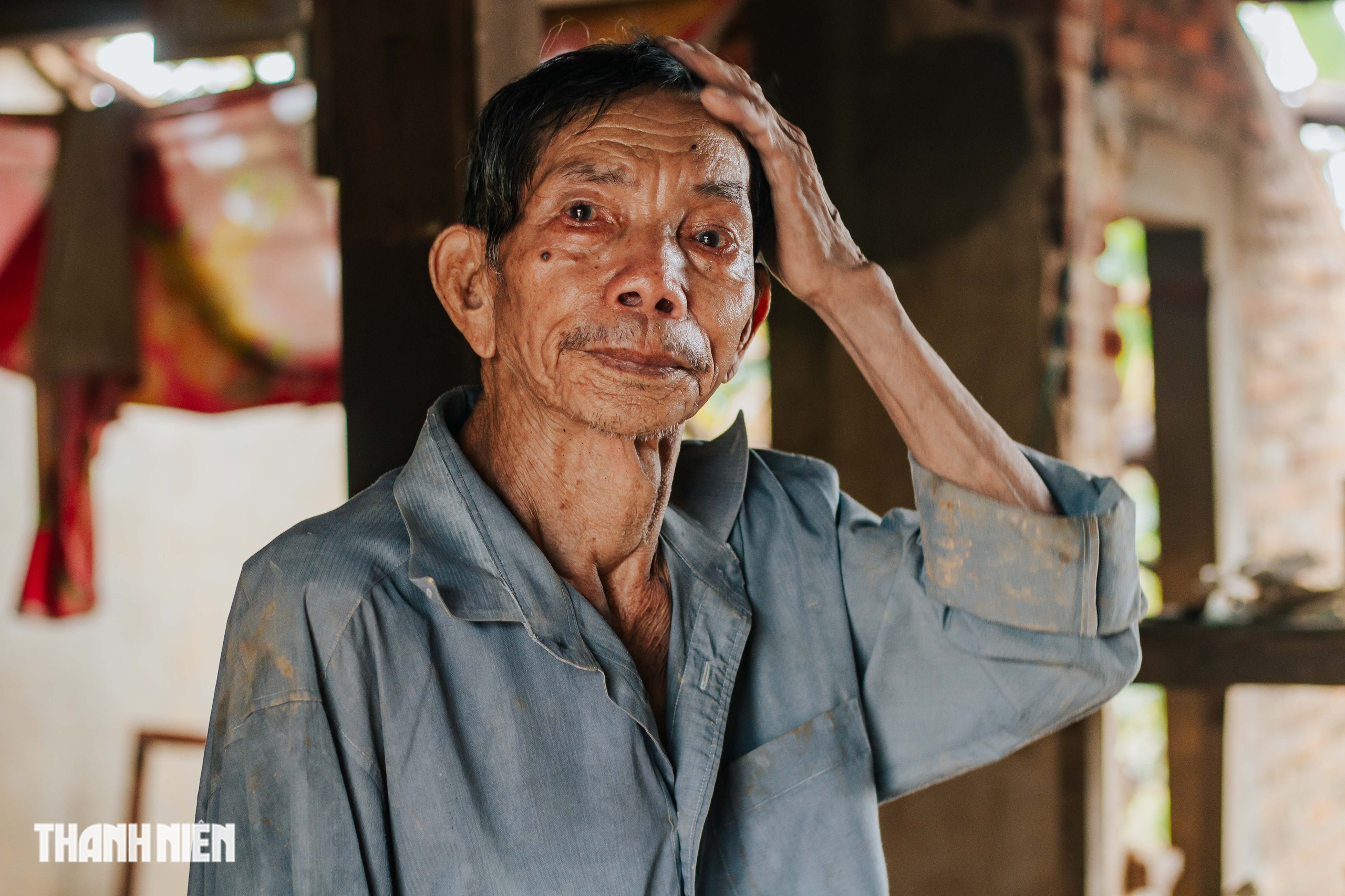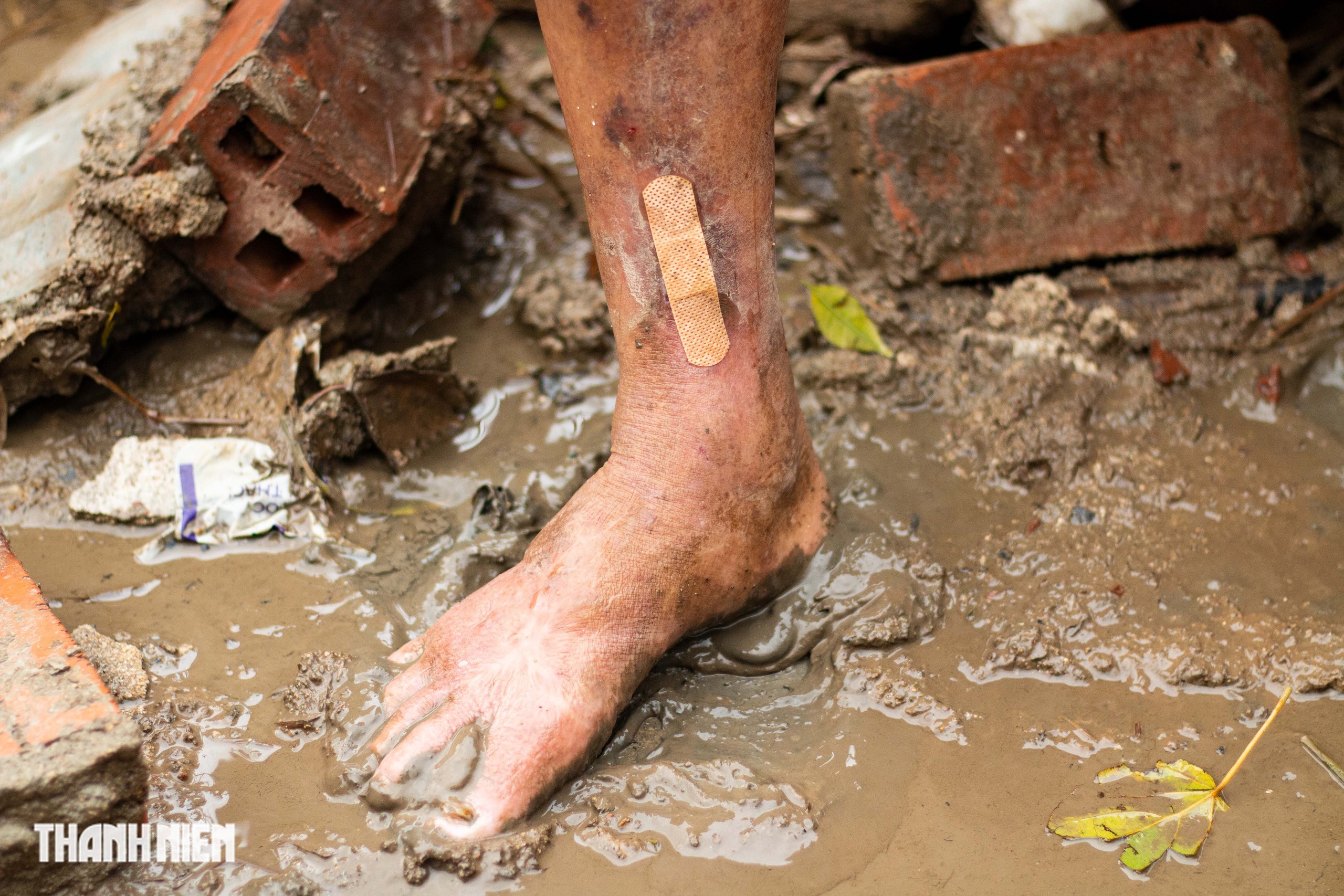 A estrada que leva à casa do Sr. Vo Chong (com 80 anos, na vila de Phu Dien Trong, comuna de Hoa Thinh) ainda está intransitável porque a água da enchente não baixou completamente. Depois de muitos dias de preocupação, o Sr. Chong voltou para casa com os pés inchados, caminhando lentamente, mas ainda assim tendo que suportar a dor para limpar a casa.