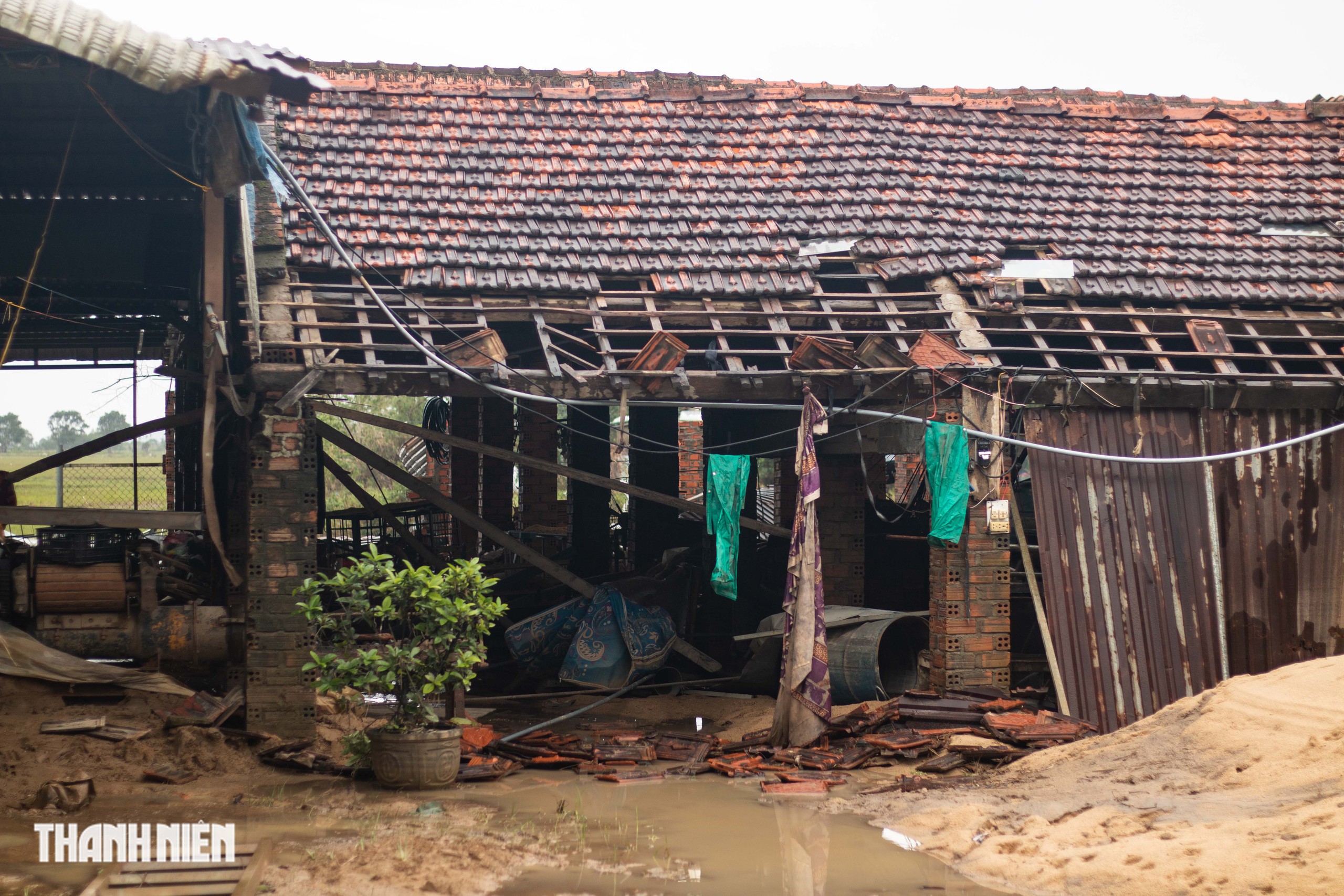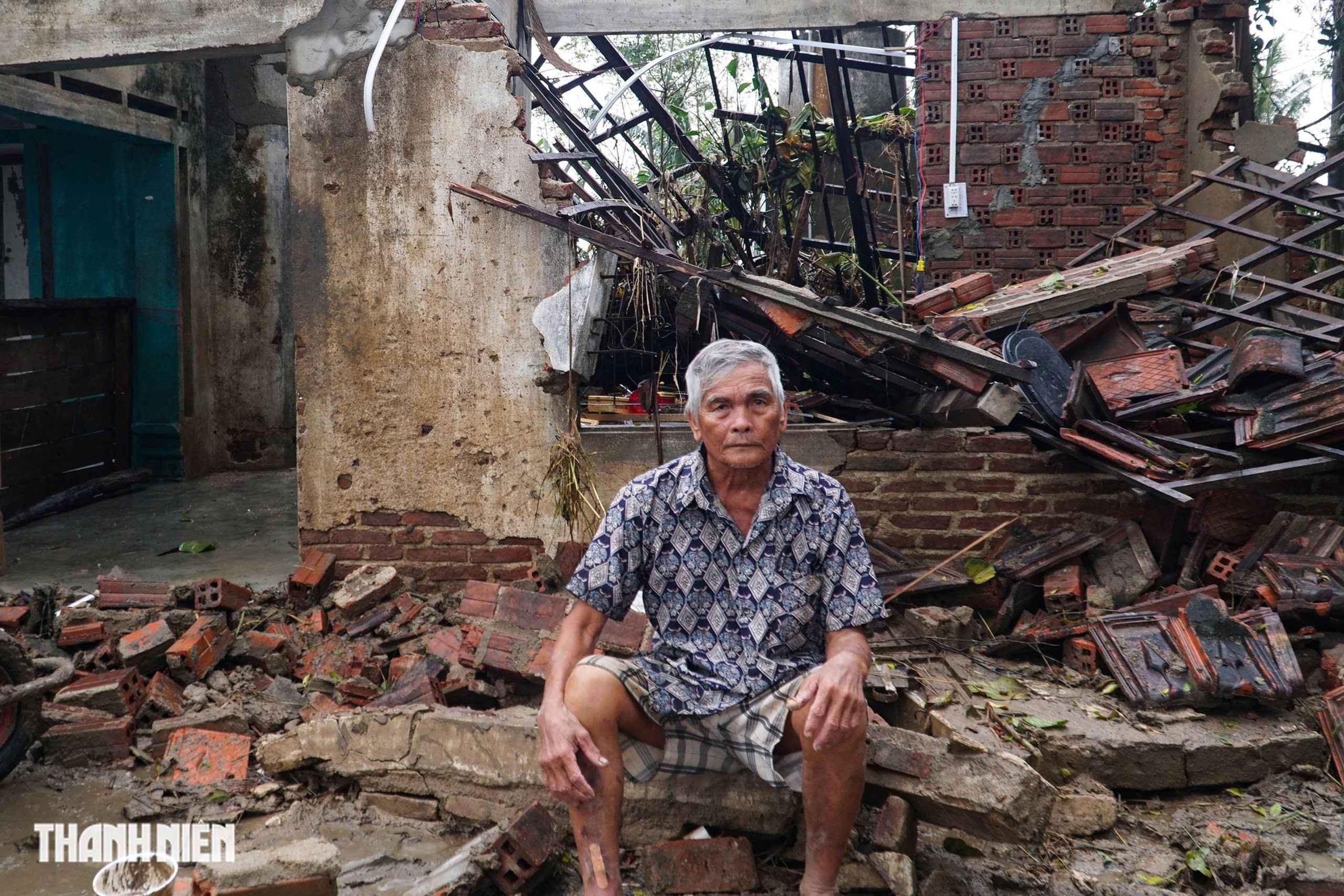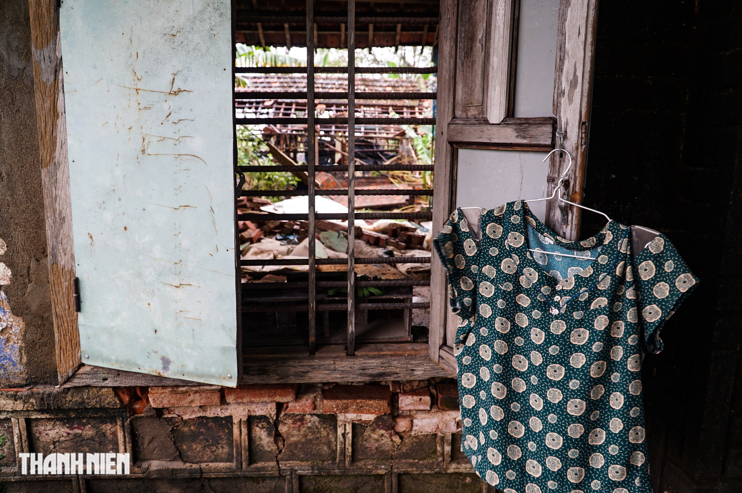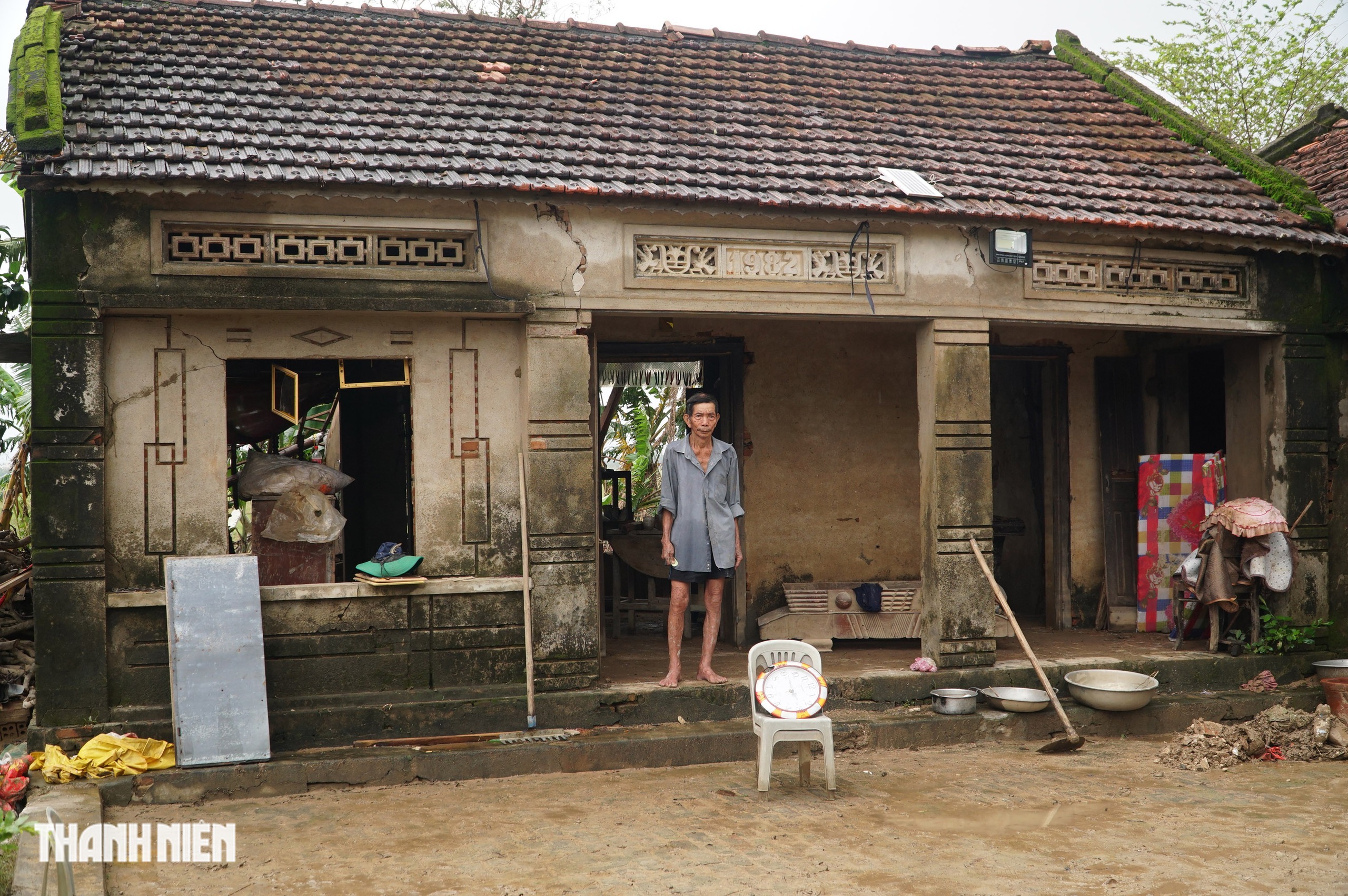 No entanto, também no epicentro das inundações em Hoa Thinh, há pessoas que agora estão simplesmente sentadas, sem saber por onde começar... porque suas casas foram quase completamente destruídas pelas águas. Repórteres do Thanh Nien atravessaram a estrada lamacenta e escorregadia até a casa do Sr. Vo Ngoc Phuong (84 anos, da comuna de Hoa Thinh), que jaz sozinha no meio dos campos da comuna. Vista de fora, a casa está tão devastada que é de partir o coração.