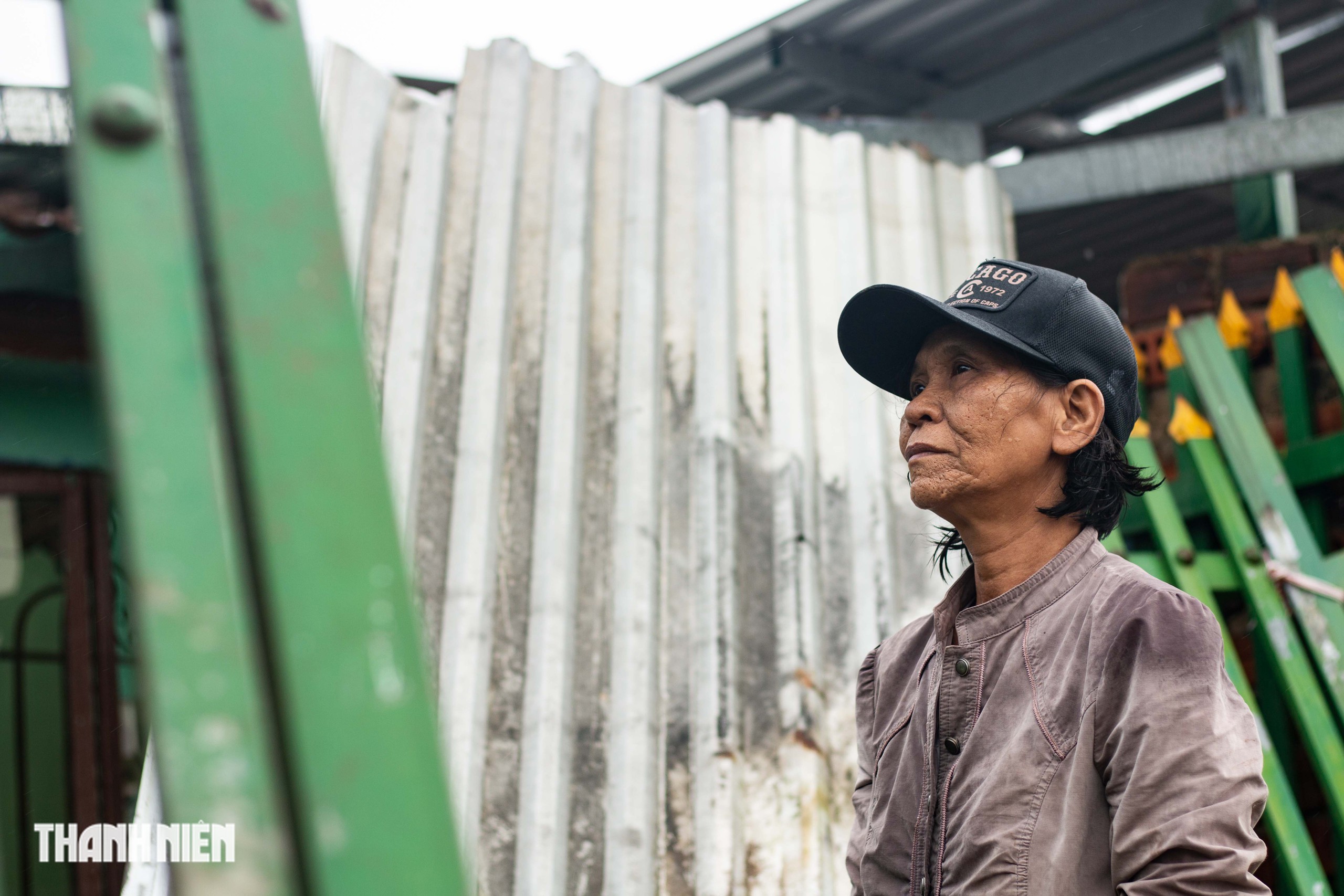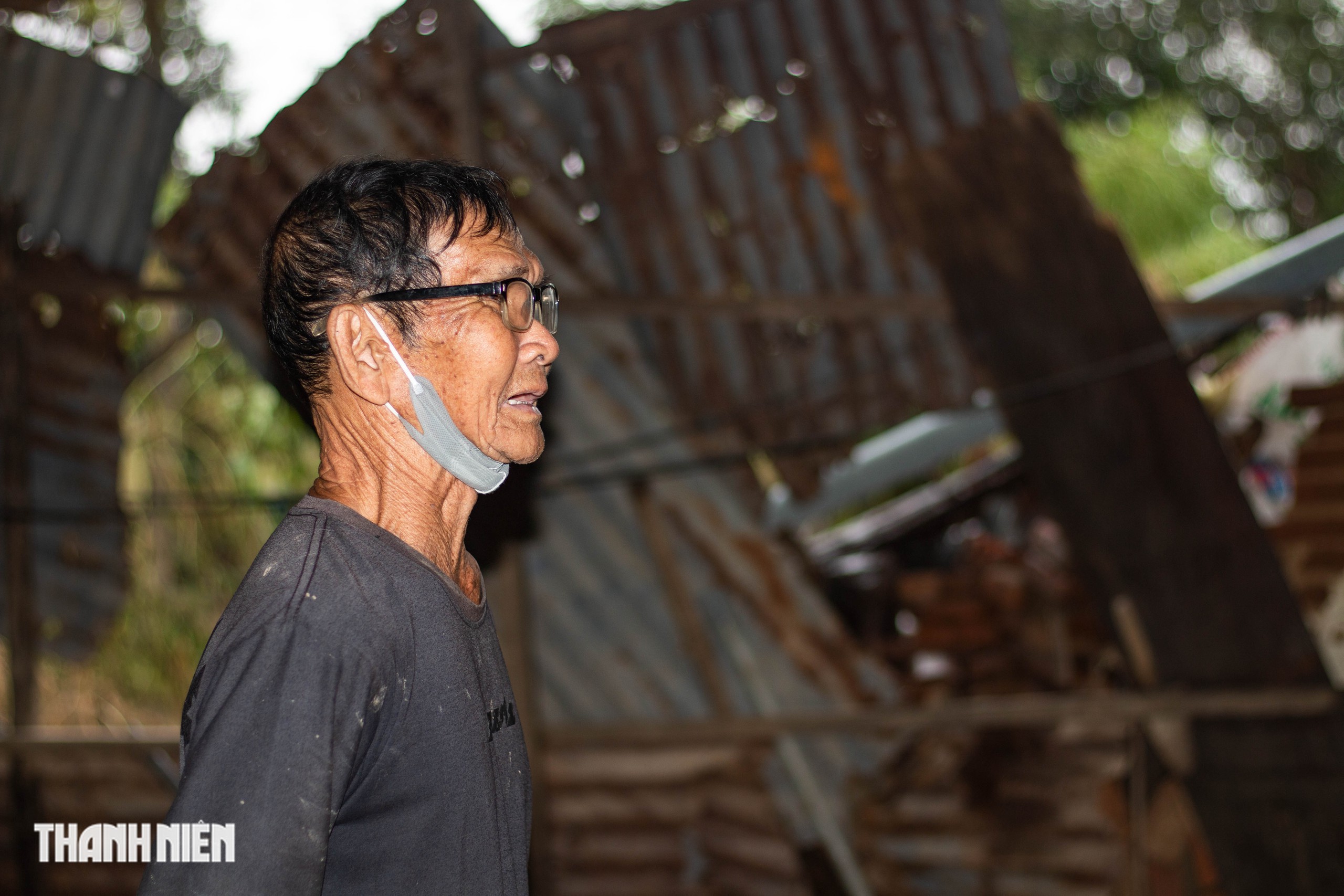 O Sr. Phuong saiu para nos cumprimentar e, em seguida, olhou para a casa de nível 4 que mal podia ser recuperada. "Quase tudo na casa foi levado pela enchente e desabou. Moro sozinho. Quando voltei da enchente e vi a casa assim, não sabia por onde começar de novo", disse o Sr. Phuong, com tristeza.