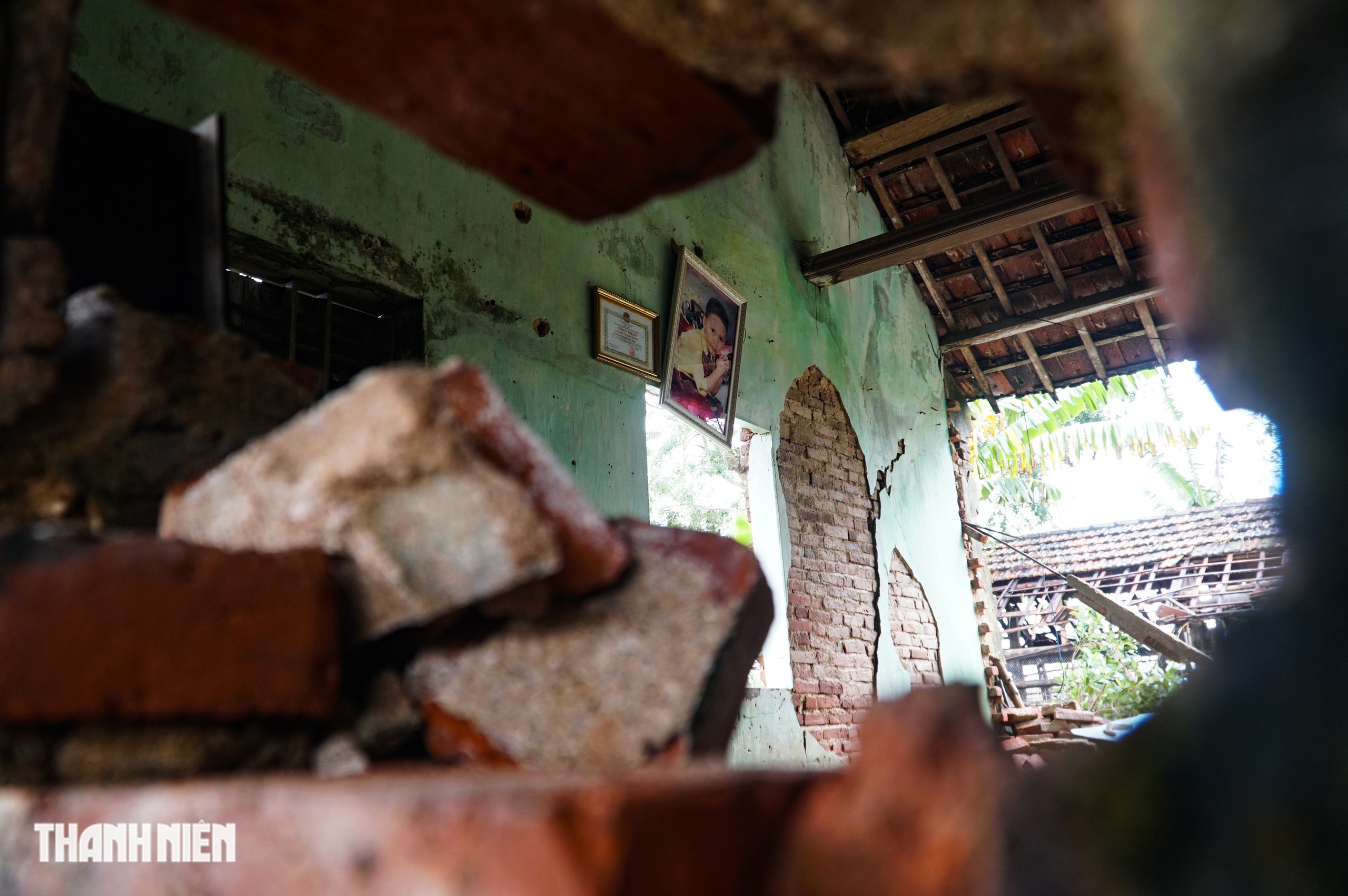 Tijolos e pedras estão espalhados no meio da casa de uma família na comuna de Hoa Thinh.