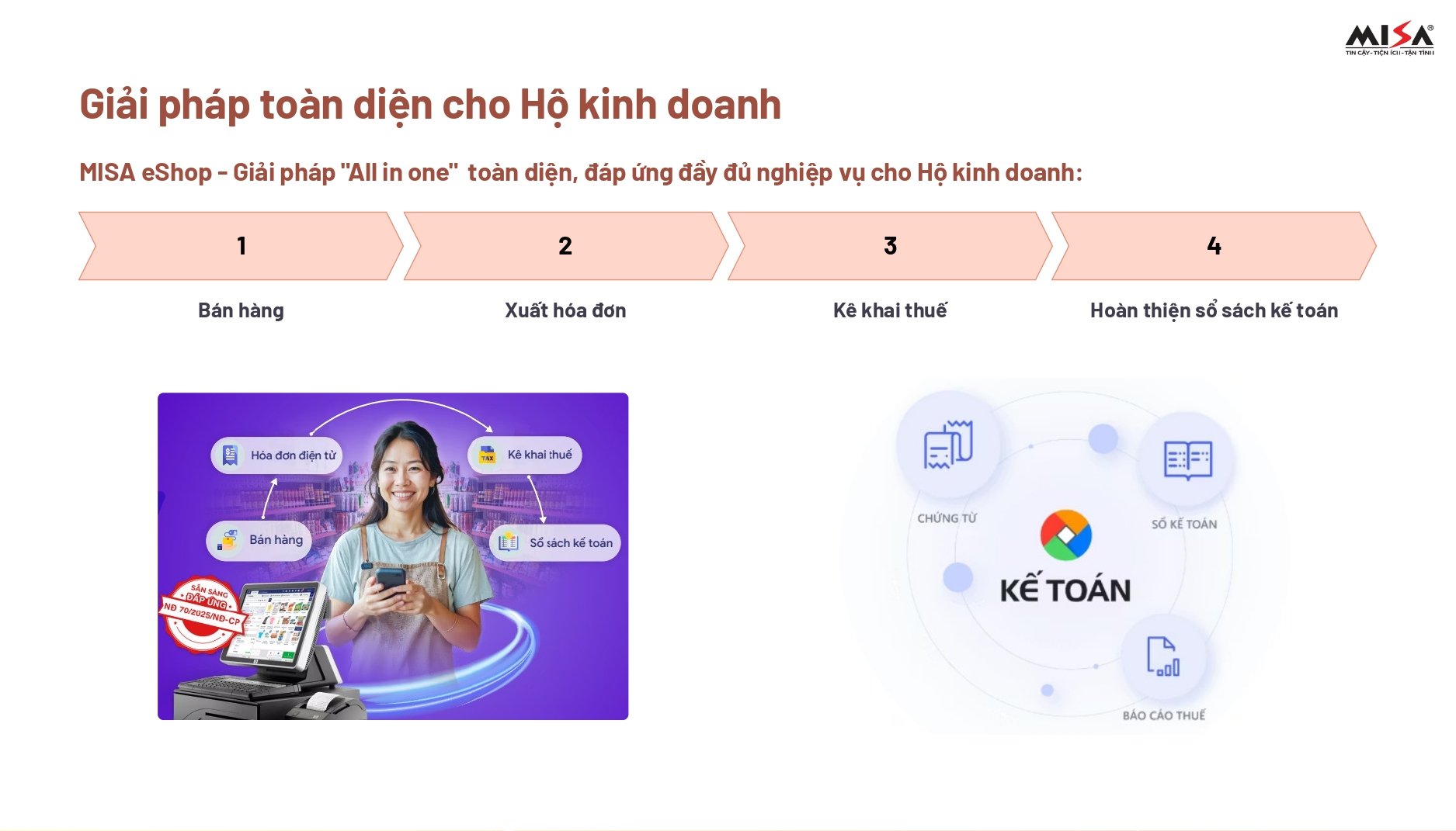 Para pequenas empresas, a MISA desenvolveu a Plataforma de Gestão de Vendas Empresariais MISA eShop para ajudar as empresas a gerenciar todas as atividades de vendas, emitir faturas, gerenciar livros contábeis, declarar impostos, etc., em um único aplicativo e com apenas um smartphone. Além disso, a solução integrada de inteligência artificial (IA) ajuda os vendedores a fazer pedidos por voz de forma rápida e fácil. O software também sintetiza dados automaticamente e envia amostras de declarações fiscais para a autoridade fiscal diretamente pelo celular.