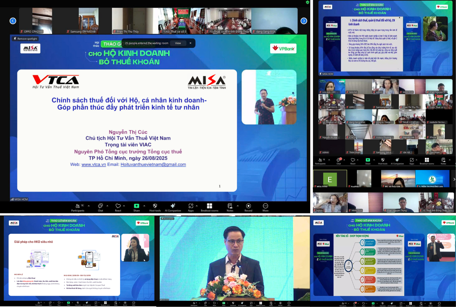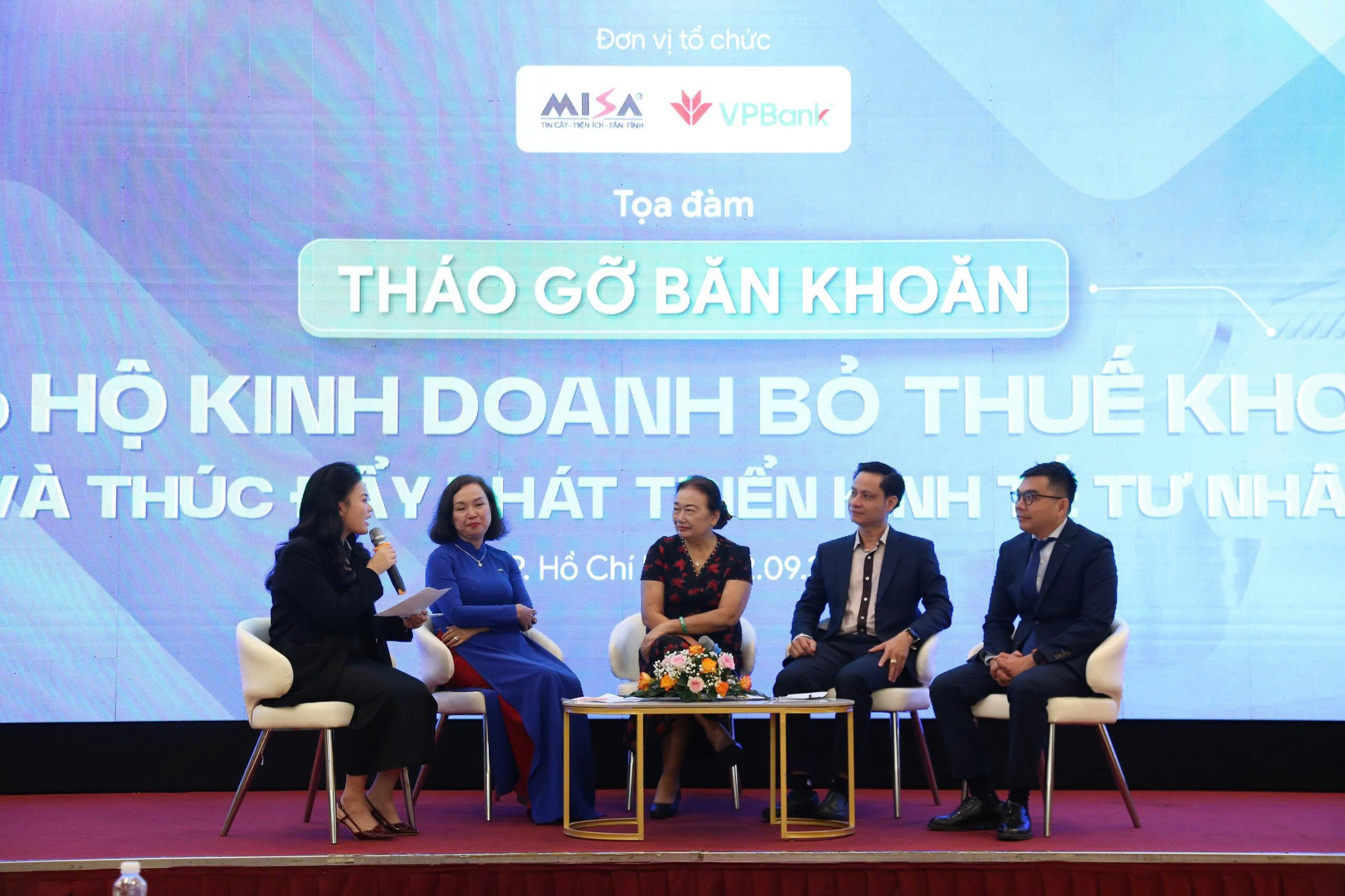 No âmbito do programa, realizou-se a seção de discussão "Resolvendo as preocupações das famílias empresárias sobre a abolição do imposto único e promovendo o desenvolvimento econômico privado", com a participação dos palestrantes: Sra. Nguyen Thi Cuc - Presidente da Associação de Consultoria Tributária do Vietnã, ex-diretora adjunta do Departamento Geral de Tributação; Sra. Le Thi Thu Huong - Presidente da Associação de Consultoria e Agentes Tributários da Cidade de Ho Chi Minh, ex-diretora adjunta do Departamento de Tributação da Cidade de Ho Chi Minh; Sr. Nguyen Minh Tuan - Diretor Geral Adjunto da MISA Joint Stock Company; Sr. Ngo Binh Nguyen - Diretor do segmento de famílias empresárias do VPBank, moderado pela Sra. Bui Thi Trang - Diretora de Soluções de Varejo da MISA. Os palestrantes discutiram e analisaram as regulamentações legais e as novas obrigações das famílias empresárias após a abolição do imposto único em alguns casos específicos, soluções tecnológicas para auxiliar as famílias na emissão de faturas, na gestão de livros contábeis e na declaração, e oportunidades de acesso a capital e fluxo de caixa para que as famílias empresárias se transformem digitalmente de forma conveniente e sustentável.