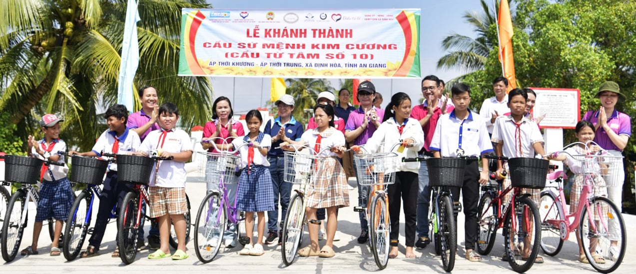 Os alunos da comuna de Dinh Hoa receberam bicicletas na cerimônia de inauguração da Ponte da Missão Kim Cuong.