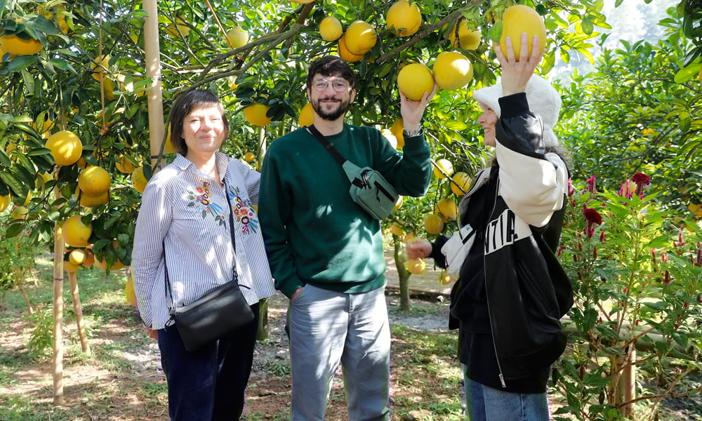 Turistas estrangeiros visitam um pomar de pomelos no bairro de Chu. Foto: The Dai. |