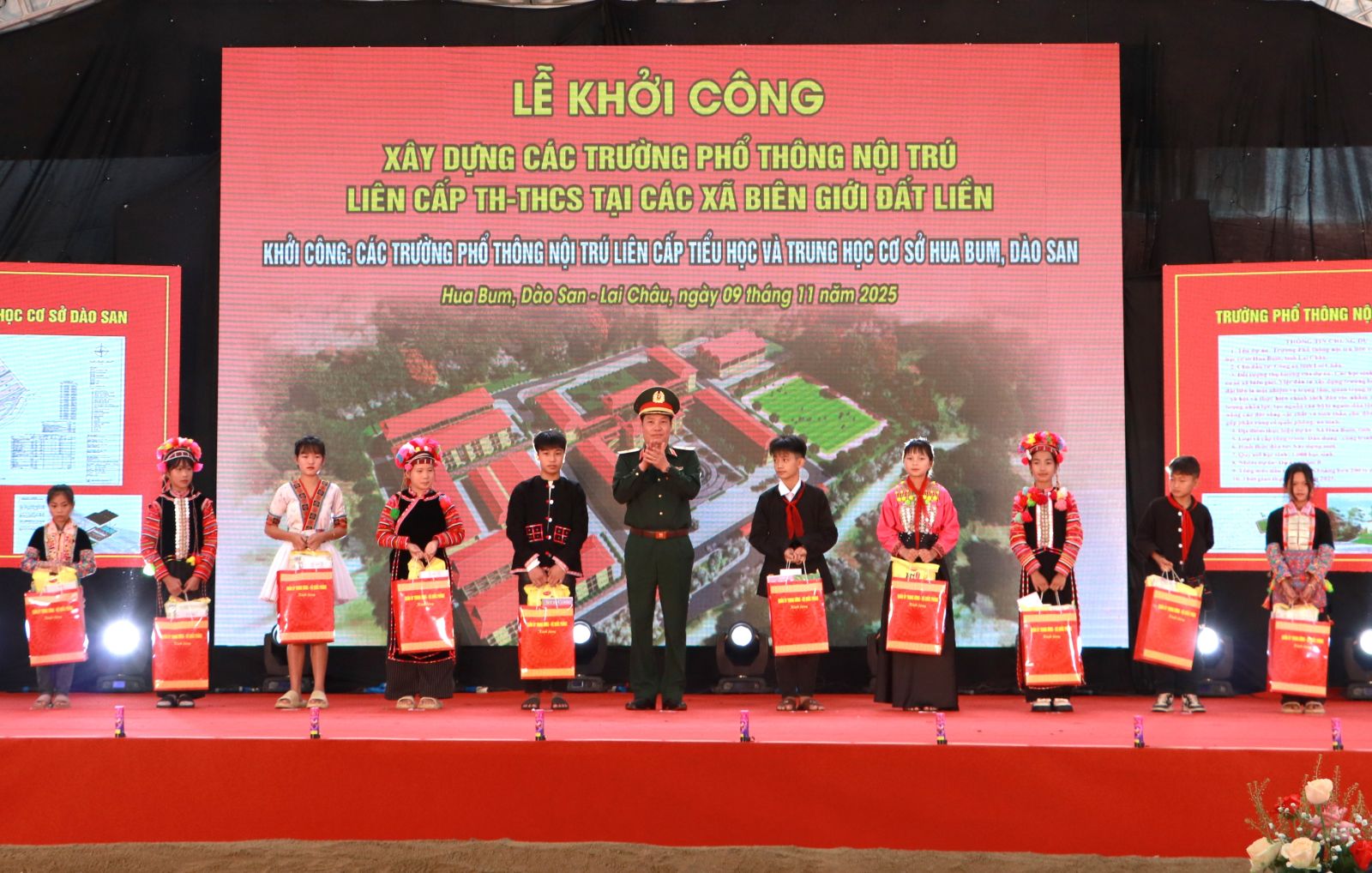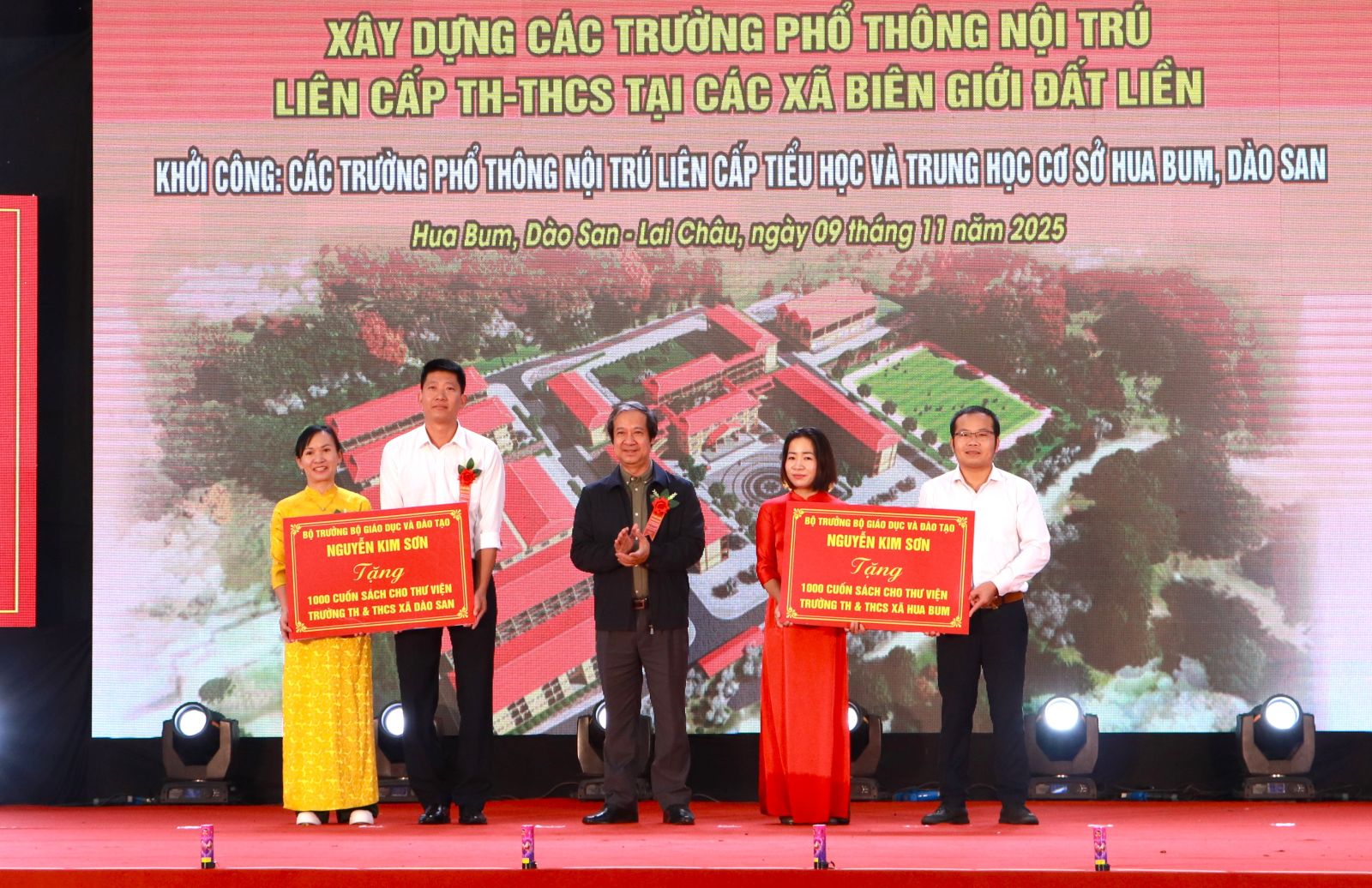 Nesta ocasião, o camarada Nguyen Kim Son, membro do Comitê Central do Partido e Ministro da Educação e Treinamento, doou 1.000 livros para a biblioteca das escolas primárias e secundárias de Hua Bum e Dao San e presenteou professores e alunos das escolas das comunas de Hua Bum e Dao San; representantes da liderança da Região Militar 2 entregaram presentes da Comissão Militar Central e do Ministério da Defesa Nacional a 10 famílias e 20 alunos da comuna de Hua Bum; o Comitê Permanente do Partido Comunista Chinês de Lai Chau presenteou o Ministro da Educação e Treinamento, Nguyen Kim Son, com flautas Mong e lenços Pieu – itens simbólicos dos grupos étnicos Mong e Thai da província de Lai Chau; o Fundo Provincial de Promoção da Educação presenteou 10 alunos de baixa renda que se destacaram nos estudos na comuna de Hua Bum. Além disso, a Polícia Provincial também presenteou 10 alunos carentes que superaram dificuldades na comuna de Hua Bum e 10 famílias da mesma comuna. A Polícia Provincial e o Comando da Guarda de Fronteiras distribuíram 150 smartphones para famílias na comuna de Hua Bum, com o objetivo de promover a transformação digital.