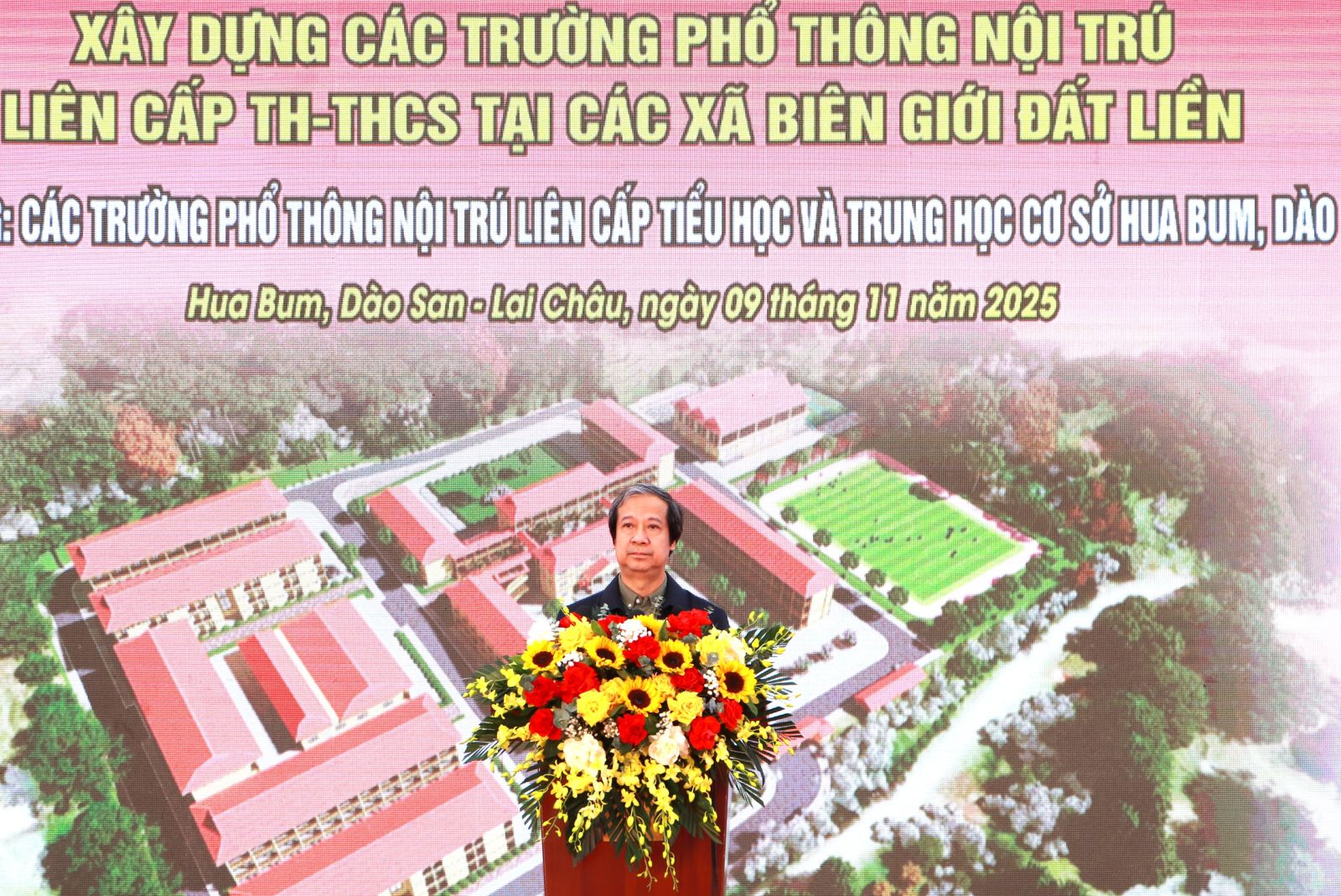 Em seu discurso, o camarada Nguyen Kim Son, membro do Comitê Central do Partido e Ministro da Educação e Formação, enfatizou que o início da construção de 100 internatos de ensino fundamental e médio em comunas fronteiriças é um passo importante na implementação da Resolução do Politburo. Trata-se de uma política de grande relevância política, social e humanística, que demonstra a atenção especial do Partido e do Estado para com as populações das áreas fronteiriças. O Ministro afirmou que as escolas estão sendo construídas de forma sincronizada e moderna, atendendo às necessidades de aprendizado e moradia dos alunos, além de oferecer acomodações para os professores, visando ao desenvolvimento integral dos estudantes e à formação de quadros locais. O Ministério da Educação e Formação mantém contato e coordena com outros ministérios e órgãos para elaborar políticas e mecanismos de atividades e regimes para professores e alunos, garantindo o funcionamento eficaz das escolas. O Ministro solicitou que as localidades, ministérios e órgãos continuem a coordenar seus esforços, aloquem capital suficiente, acelerem o andamento das obras e concluam o plano dentro do prazo, para que as escolas entrem em funcionamento em breve, contribuindo para a redução das desigualdades regionais, o aprimoramento do conhecimento da população, o fortalecimento da defesa nacional, a segurança e o desenvolvimento sustentável das áreas fronteiriças.
