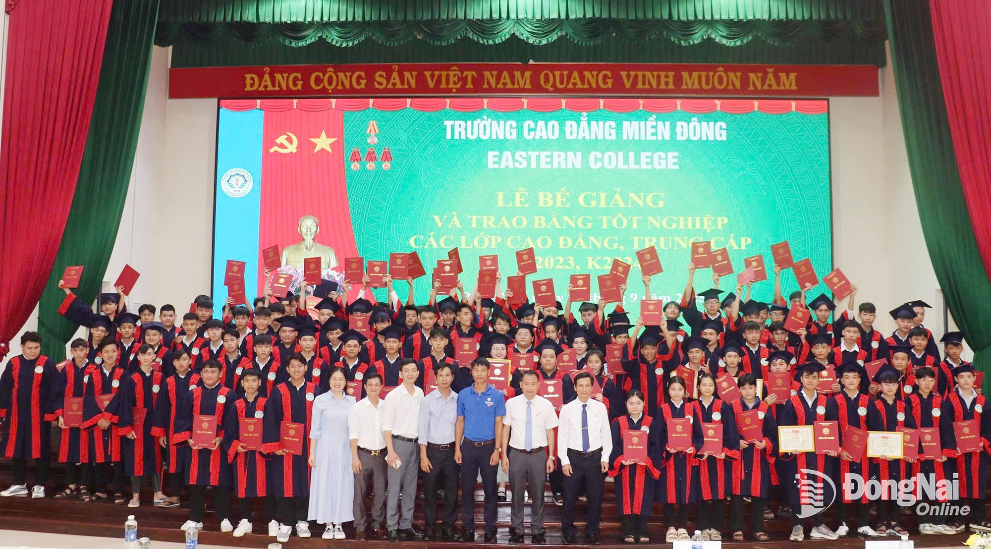 O Eastern College ( Binh Phuoc Ward) implementou diversas inovações em sua interação com empresas, combinando teoria e prática, contribuindo para a melhoria da qualidade do treinamento. Na foto: Cerimônia de encerramento das turmas de ensino fundamental e médio (K2023 e K2024) da escola. Foto: Pham Quang |