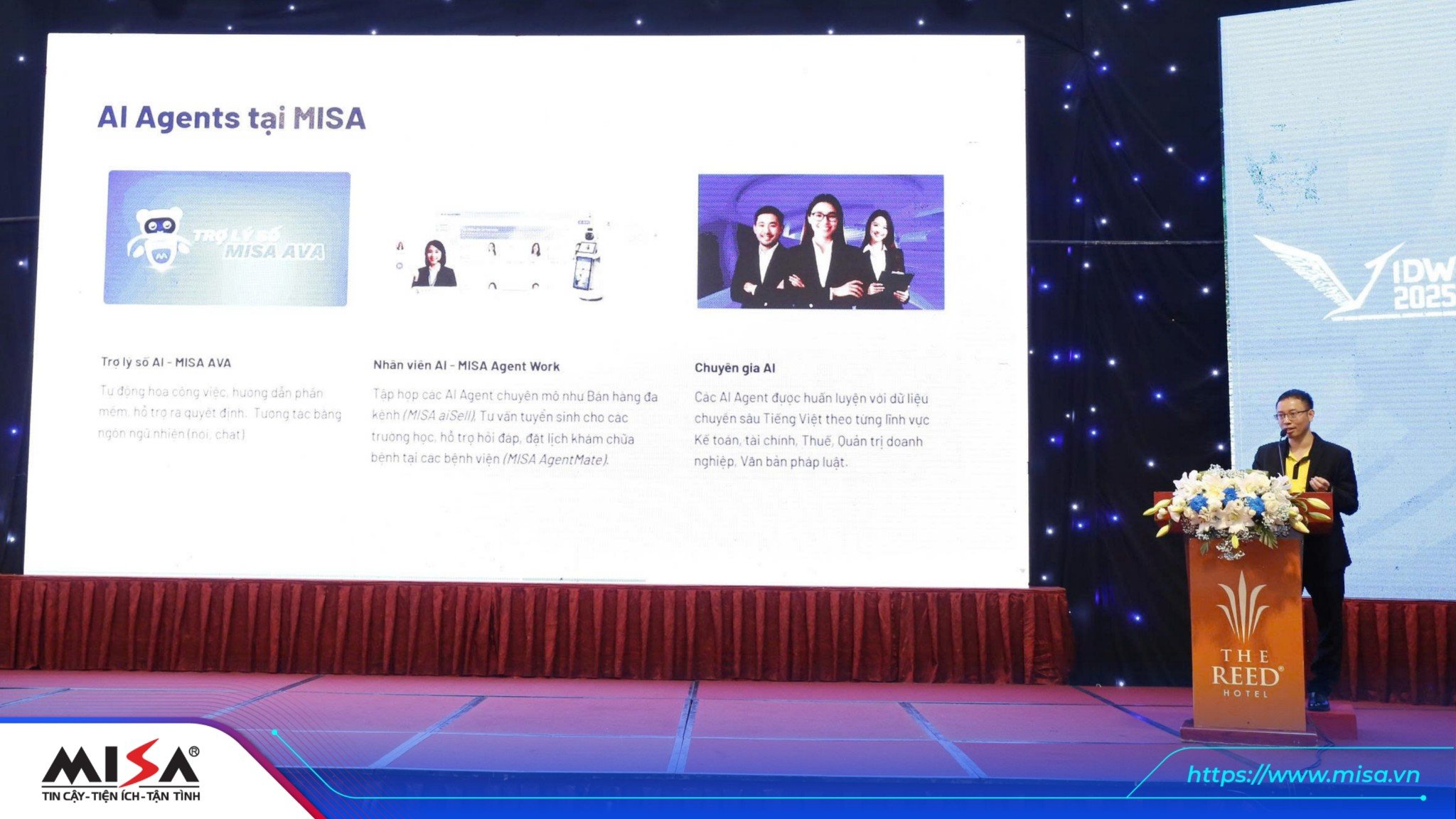 No evento, a MISA deixou uma forte impressão com compartilhamentos inspiradores e atividades excepcionais. O vice-presidente do Conselho de Administração da MISA, Nguyen Xuan Hoang, apresentou o tema "MISA - Remodelando produtos para a IA em Primeiro Lugar" , compartilhando como a MISA utiliza o poder da inteligência artificial para inovar plataformas de gestão, visando atender da melhor forma possível empresas, organizações e indivíduos.