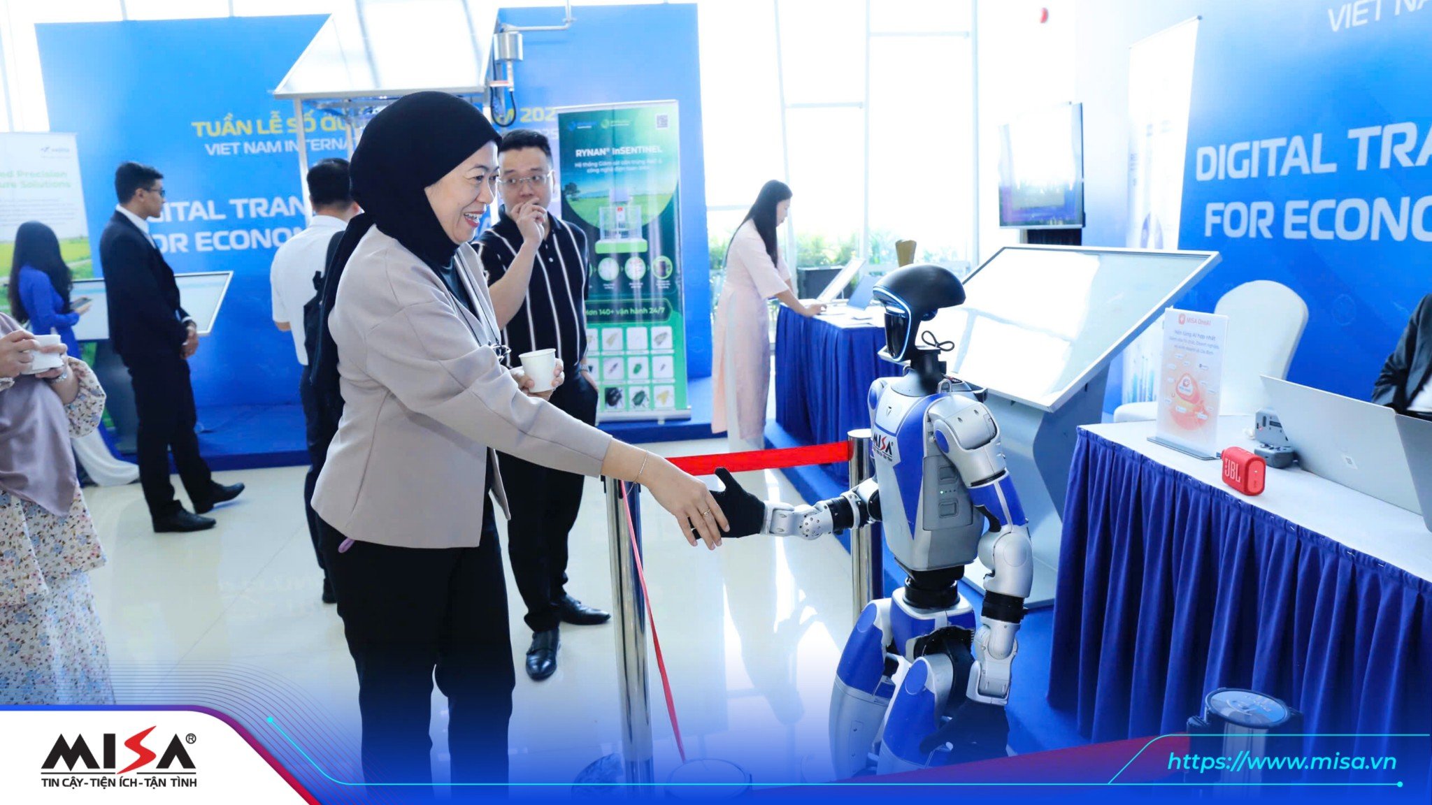 Em particular, a presença do robô MISA no espaço da exposição atraiu a atenção de muitos amigos e visitantes internacionais. O robô não é apenas um símbolo da capacidade tecnológica e do espírito inovador da MISA, mas também traz uma imagem vívida da aplicação da IA na vida e no trabalho, contribuindo para a disseminação da mensagem "IA em primeiro lugar - Usuário em primeiro lugar".