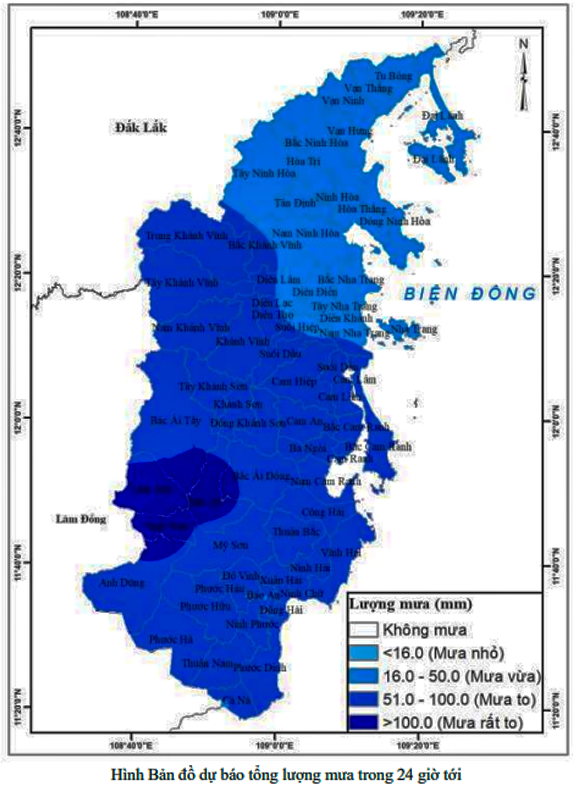 A previsão para o dia e a noite de 10 a 12 de dezembro indica tempo nublado na província de Khanh Hoa , com chuva a moderada; no norte e oeste da província, podem ocorrer chuvas fortes e trovoadas em alguns pontos. A precipitação total será geralmente de 20 a 60 mm, podendo ultrapassar os 90 mm em algumas áreas do oeste.