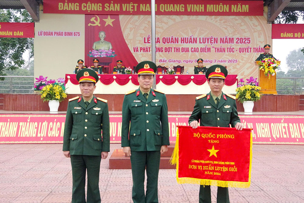 | Líderes e comandantes da Brigada de Artilharia 675 receberam a bandeira de Unidade de Treinamento de Excelência do Ministério da Defesa Nacional , em março de 2025. Foto: THANH HUONG |
