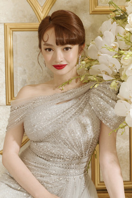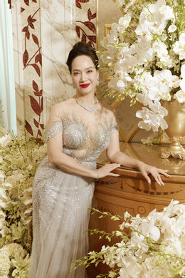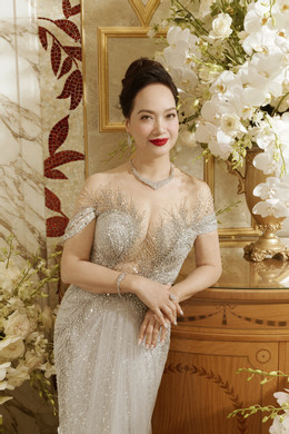 O detalhe tomara que caia realça o charme, combinado com centenas de pedras preciosas meticulosamente aplicadas. Cada costura meticulosa realça os traços sensuais e atraentes, deixando uma impressão duradoura. O carisma de Kathy Uyen se mistura com os raios de luz penetrantes da saia.