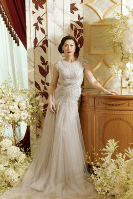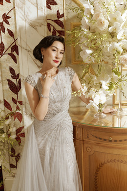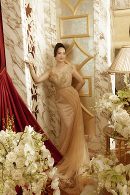 Kathy Uyen exala a elegância discreta e a classe de uma mulher madura em um vestido sereia clássico, com cintura delicada e saia levemente rodada.