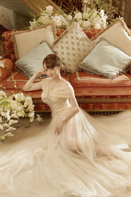 O pescoço e o corpete são bordados à mão com motivos florais, criando um halo vibrante e curvilíneo. O estilo rococó é caracterizado por milhares de lantejoulas e pedras preciosas brilhantes, criando um efeito mágico e cintilante que se adapta às curvas do corpo.