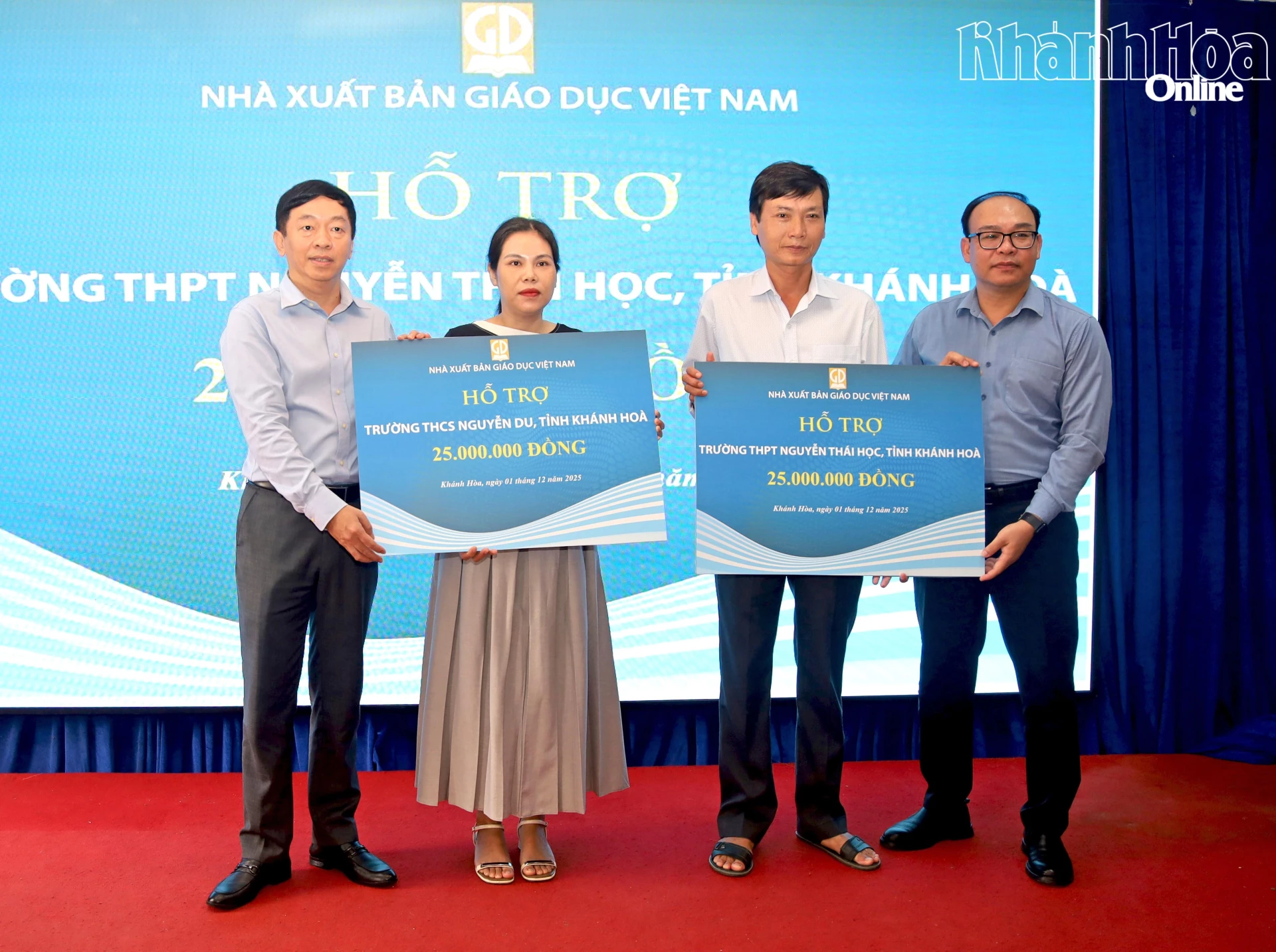| Um representante da Editora Educacional do Vietnã entregou uma placa simbólica de doação de livros didáticos aos líderes do Departamento de Educação e Treinamento de Khanh Hoa. |