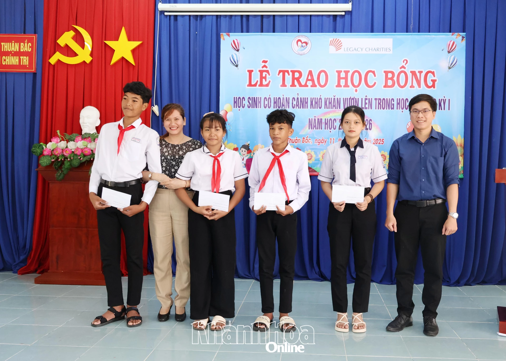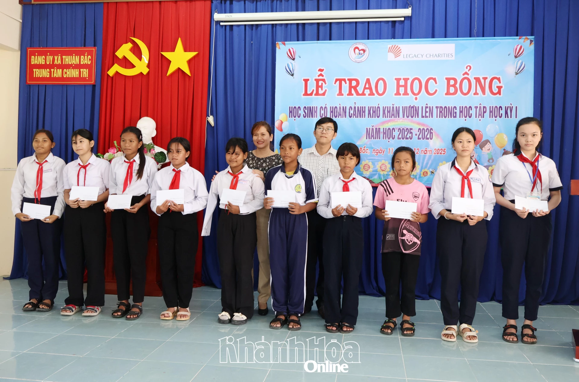 Na cerimônia, representantes da Legacy Charities Vietnam, do Conselho de Gestão Não-Projeto, do Centro de Assistência Social de Ninh Thuan e do Comitê Popular da Comuna de Thuan Bac concederam 25 bolsas de estudo a estudantes carentes que se destacaram nos estudos durante o primeiro semestre do ano letivo de 2025-2026 na comuna. Cada bolsa de estudo tem o valor de 1,25 milhão de VND, patrocinada pela Legacy Charities (EUA).