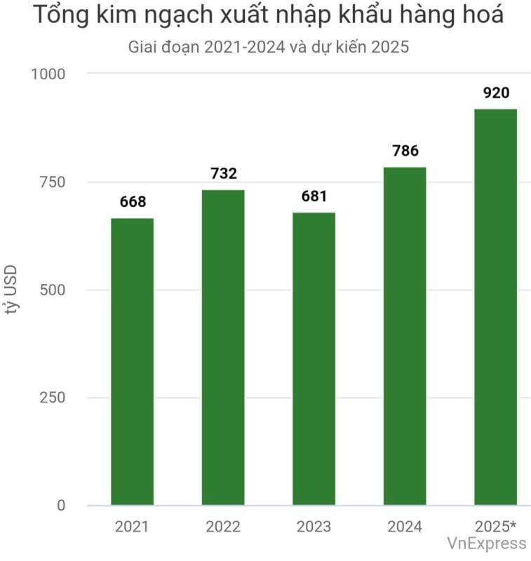 Na reunião do Governo em 6 de dezembro, o Ministro da Indústria e Comércio, Nguyen Hong Dien, afirmou que, com a taxa de crescimento atual, as importações e exportações para o ano de 2025 poderão atingir 920 bilhões de dólares ou mais. Dessa forma, o Vietnã estará entre os 15 países com o maior volume de comércio do mundo .
