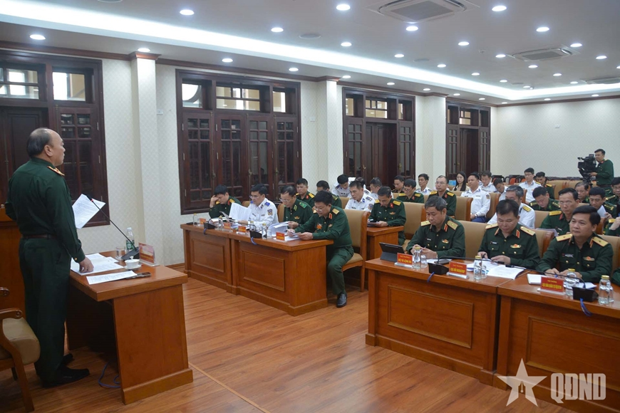 | Đại tá Nguyễn Thịnh Tiệp, Phó tham mưu trưởng Quân chủng Hải quân phát biểu tại phiên họp. |