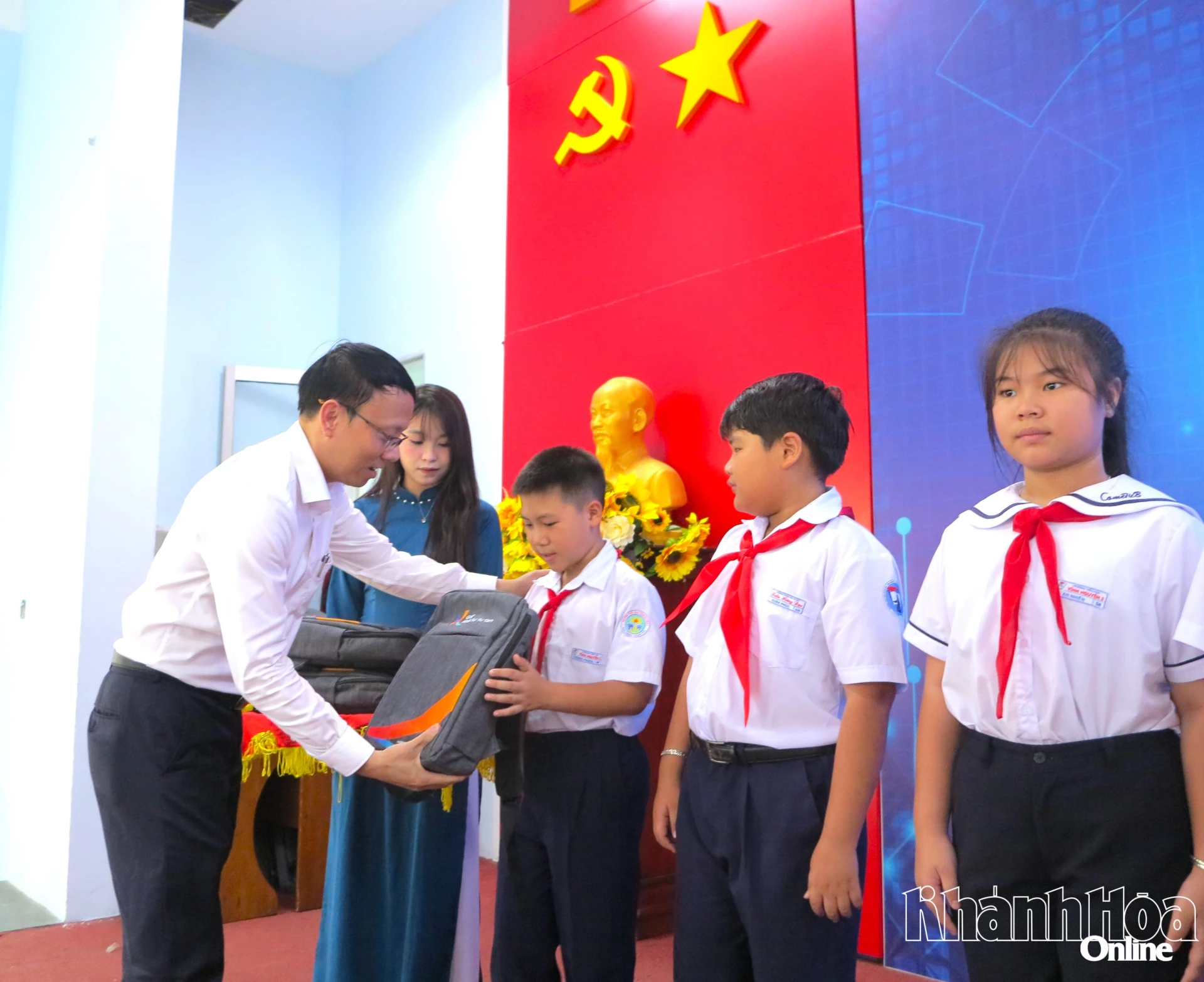 | Đồng chí Nguyễn Thanh Hà trao quà cho học sinh. |