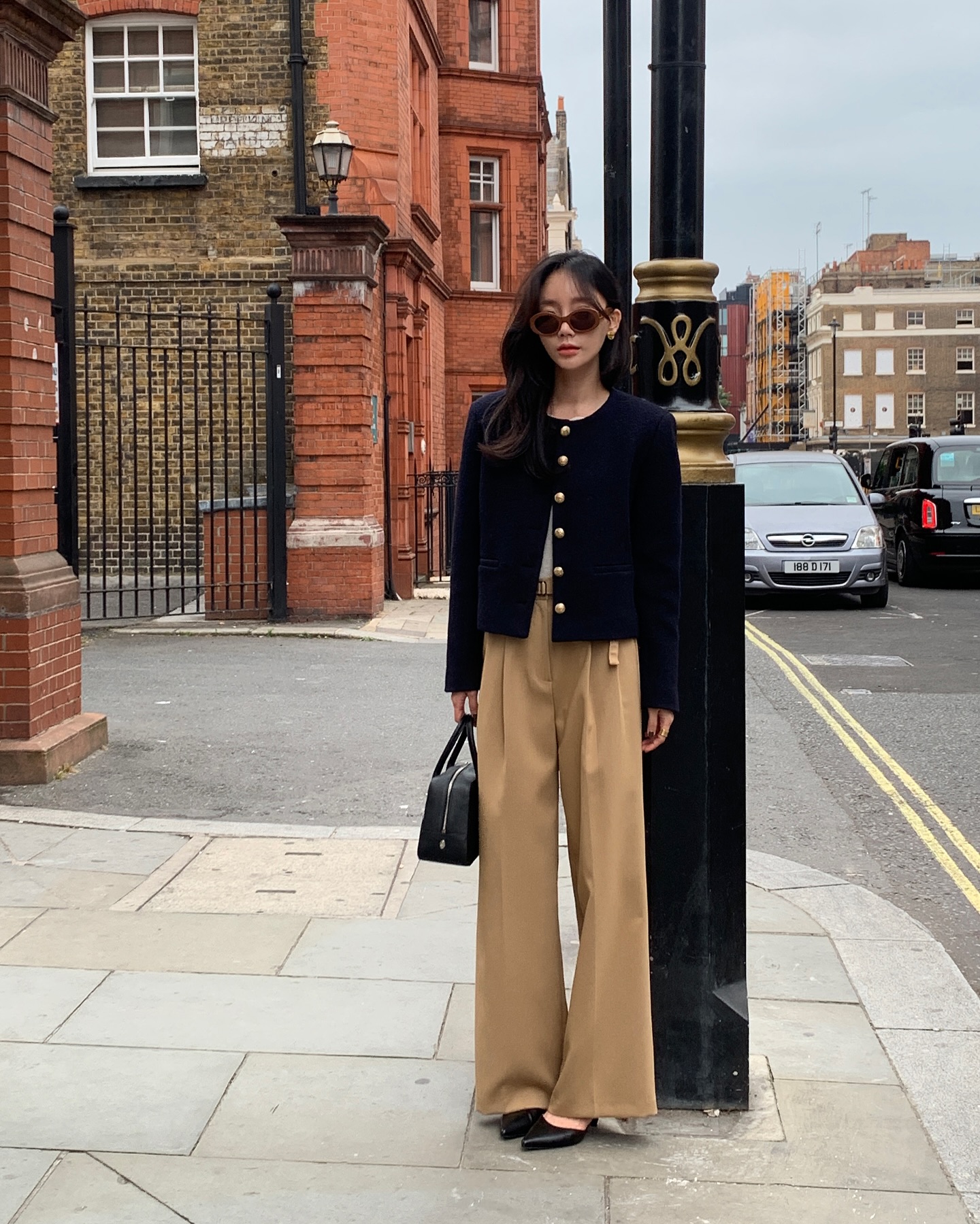 Ținuta de mai sus include articole standard elegante, cum ar fi o jachetă cu guler rotund, pantaloni drepți și pantofi cu vârful ascuțit. Deși foarte luxoasă și elegantă, ținuta de mai sus nu adaugă vârstă purtătorului. Pentru a asigura rafinamentul ținutei, femeile ar trebui să aleagă pantofi și genți minimaliste.