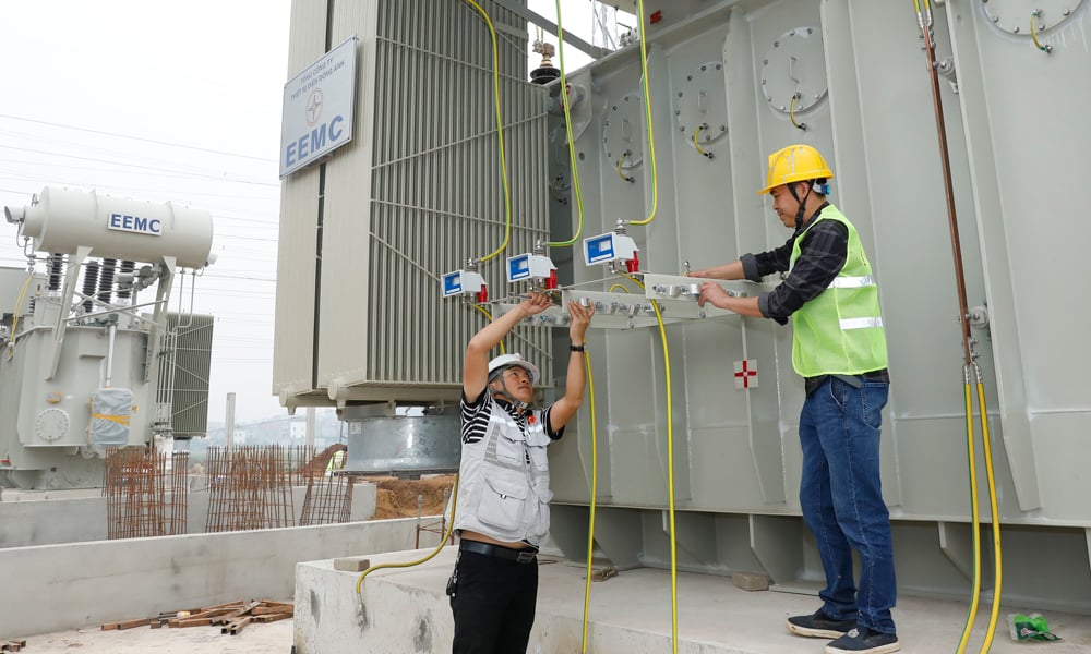 Instalarea transformatoarelor în cadrul proiectului liniei de transport și substației de 110 kV Quang Chau. |