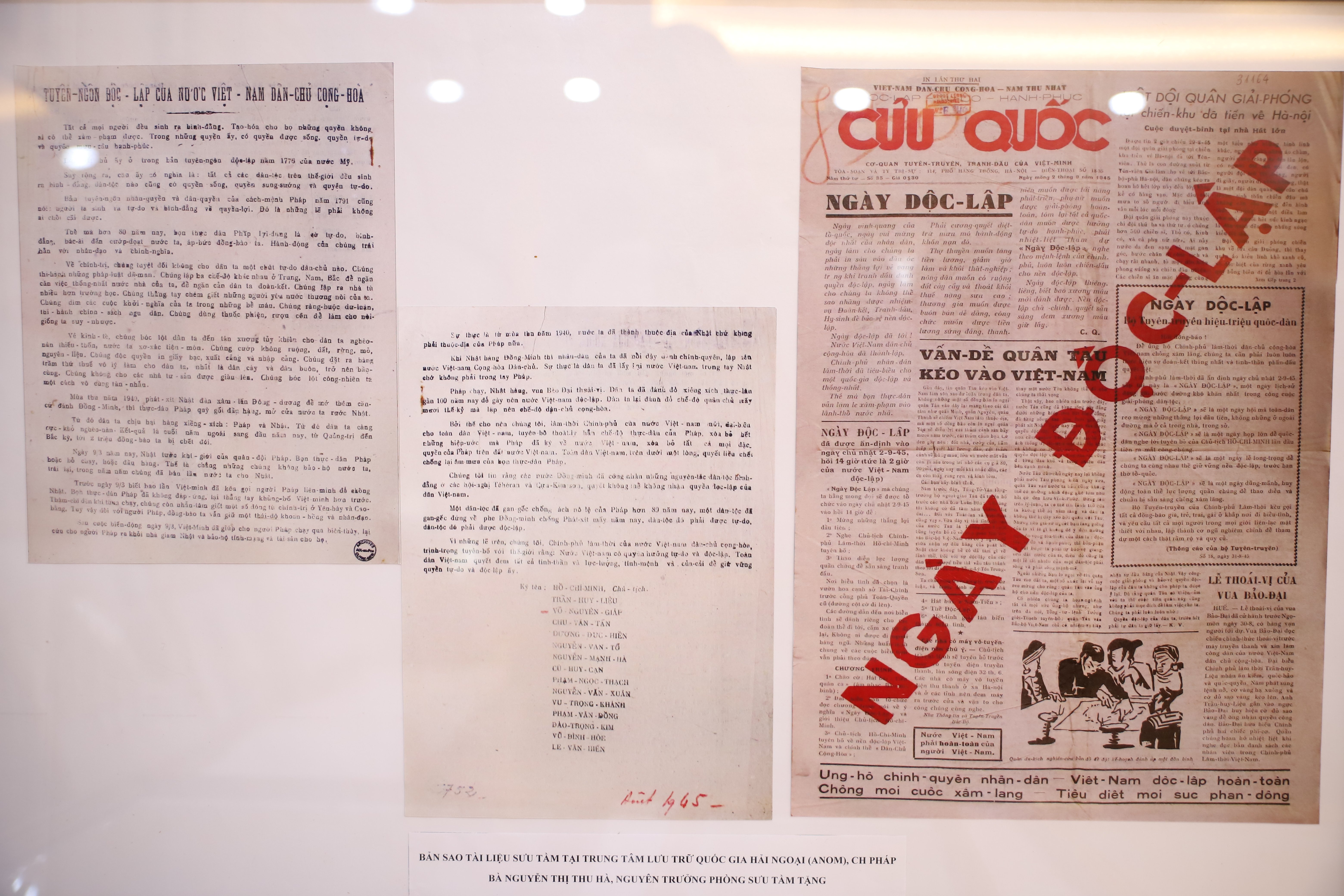 - Documente donate de dna Nguyen Thi Thu Ha, fosta șefă a Departamentului de Colecții, Muzeul Ho Și Min: Mai multe copii ale Declarației de Independență a Republicii Democrate Vietnam din 2 septembrie 1945 și ale Ziarului Salvării Naționale, colectate în mai multe arhive ale Republicii Franceze și Vietnam.