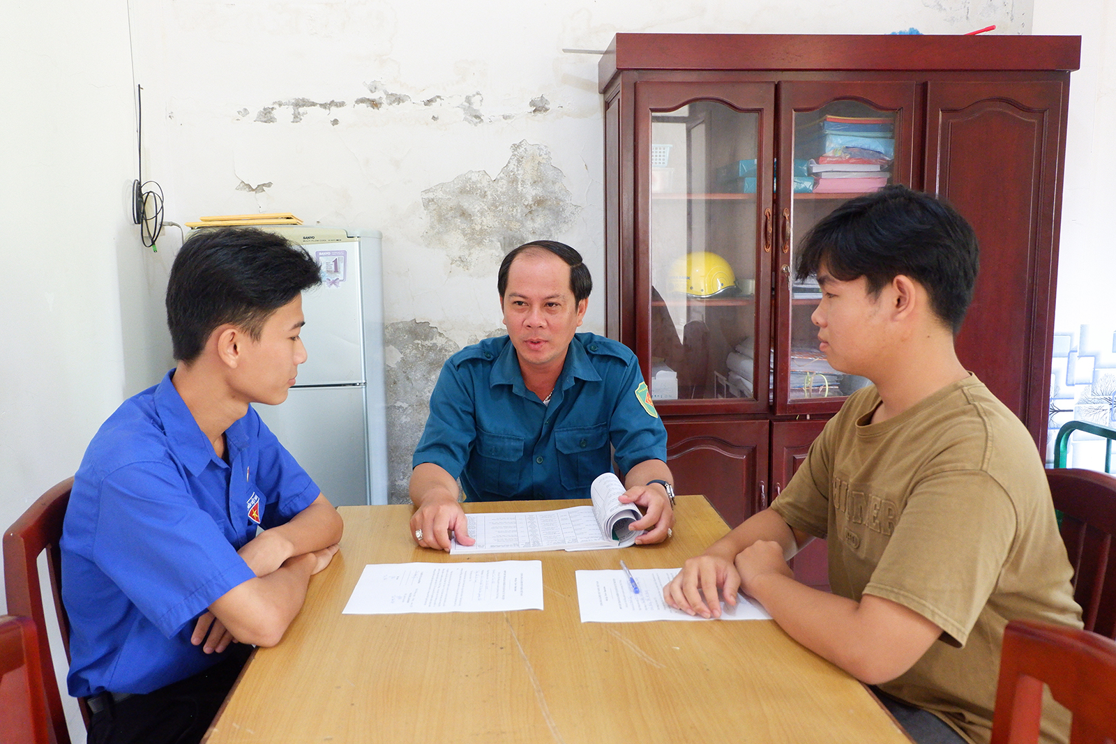 Comandantul adjunct al Comandamentului Militar al districtului Vinh Thong, Nguyen Viet Cuong (centru), propovăduiește Legea privind serviciul militar tinerilor Tran Tien Dat (coperta stângă) și Le Thanh Quy. Fotografie: THU OANH