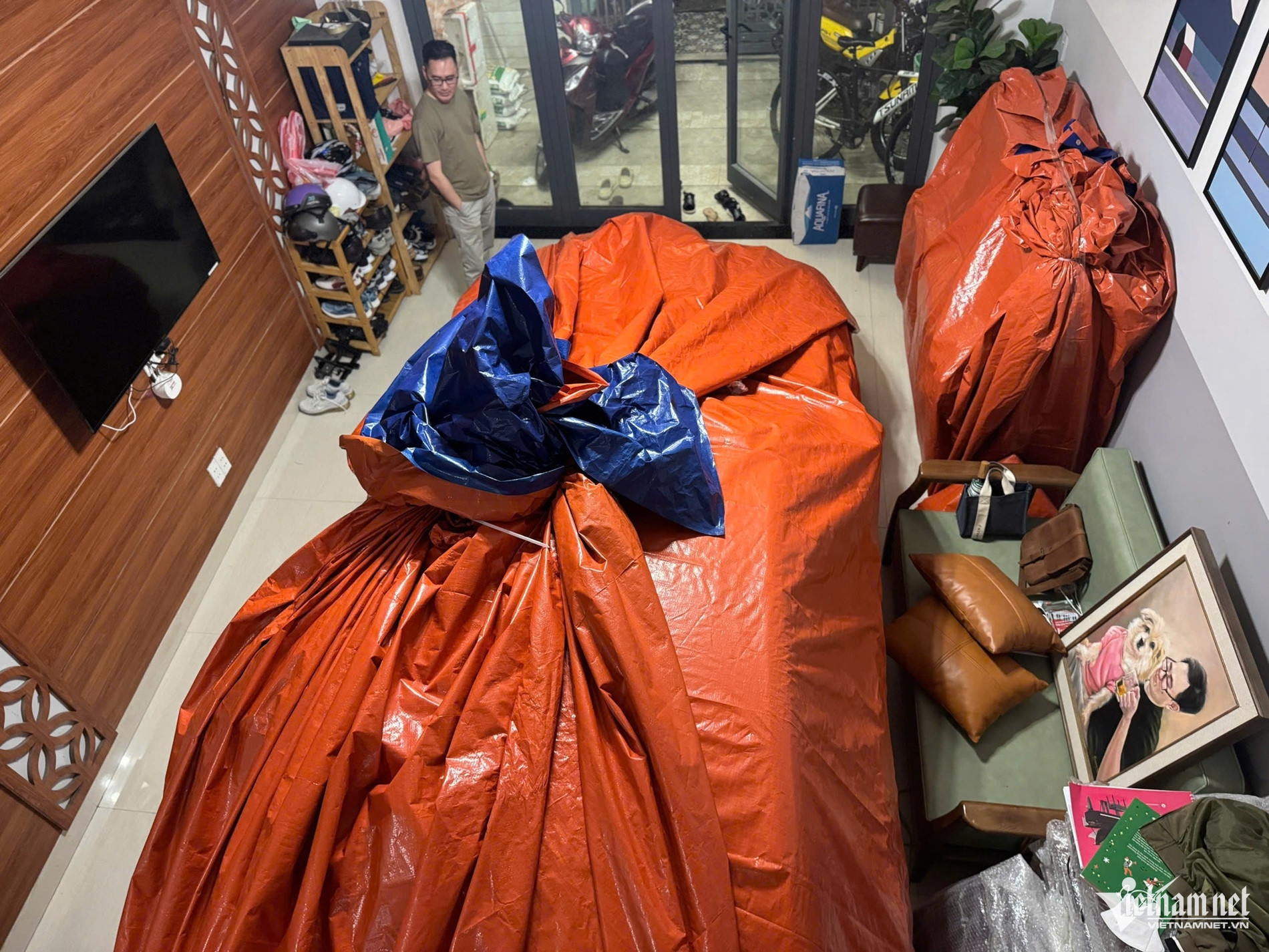 Între timp, domnul Tran Thanh Nguyen, care locuiește pe strada Me Nhu (cartierul Thanh Khe), a declarat că a cumpărat o prelată de 6x12 m pentru 500.000 VND de la un magazin de materiale de construcții pentru a-și „acoperi” mașina și a preveni inundațiile.