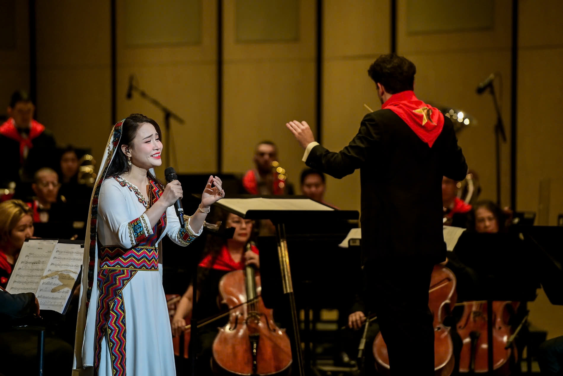 Un moment deosebit de emoționant a fost după pauză, când întreaga orchestră și dirijorul au purtat eșarfe imprimate pe umeri cu steagul roșu și o stea galbenă.