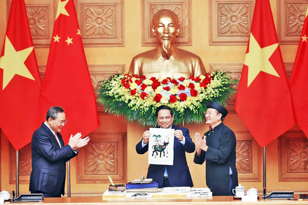 Artizanul Nguyen Huu Hoa îi prezintă și îi îndrumă pe prim-ministrul Pham Minh Chinh și pe prim-ministrul chinez Li Cuong în tipărirea picturilor populare Dong Ho. |