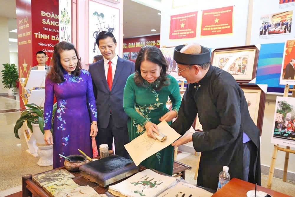 Vicepreședintele Vo Thi Anh Xuan și liderii provinciali au experimentat tehnica de imprimare a picturilor populare Dong Ho la standul care expunea imagini și documente pentru a ura bun venit primului Congres de Emulație Patriotică al provinciei Bac Ninh, perioada 2025-2030 (septembrie 2025). |