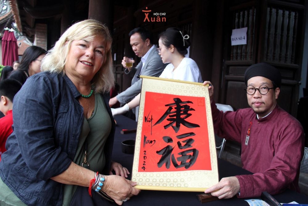 Vizitatorii internaționali experimentează arta caligrafiei la Templul Literaturii din Hanoi. Fotografie: Huy Pham