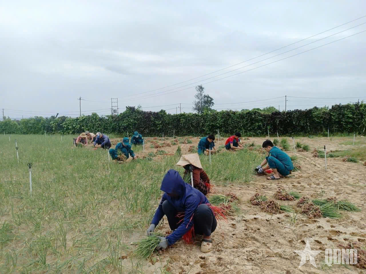 Miliția din Zona Specială Ly Son îi ajută pe oameni să recolteze ceapă înainte de furtună. |