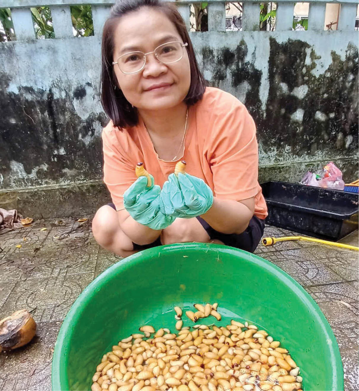„Creșterea viermilor de cocos este foarte simplă, nu necesită mult efort și poate fi gestionată oricând aveți timp liber. Larvele sunt plasate în ghivece de plastic cu capace și găuri pentru ventilație. Apoi, se adaugă fibre și fructe de cocos ca hrană, iar ocazional se pot adăuga tărâțe de orez și tărâțe de porumb în proporții adecvate. După 10 zile, larvele mamă sunt separate pentru a reproduce un nou lot. Ciclul de la momentul în care viermii de cocos încep să se reproducă până la recoltarea larvelor pentru vânzare este de aproximativ 40-45 de zile. După 3 reproduceri, se înlocuiește un nou lot de larve și apoi se pot selecta cele mai puternice larve pentru a fi rasa pentru următorul lot”, a spus dna Chanh.