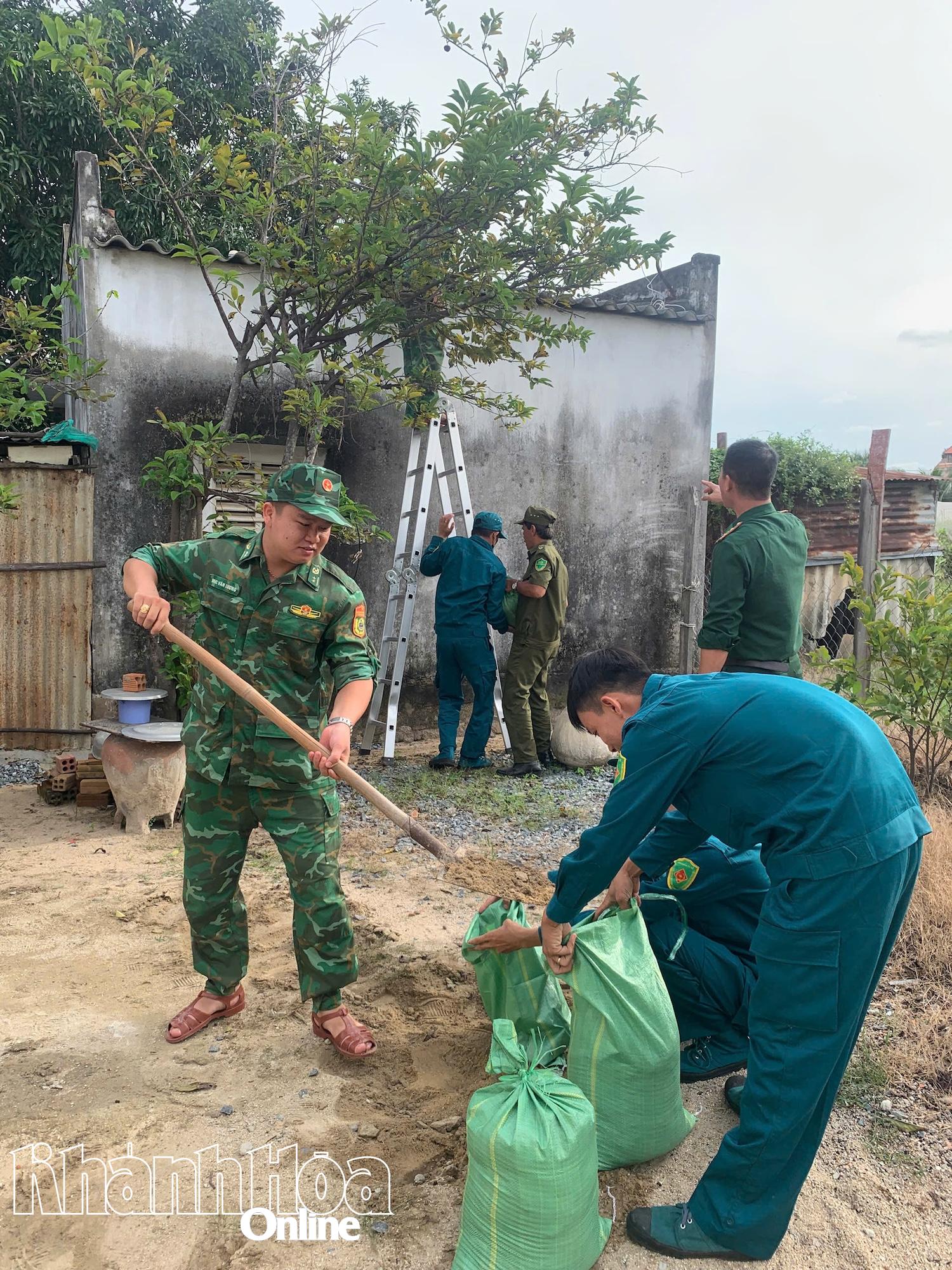 | Forțele armate ale districtului Ninh Chu pregătesc saci de nisip pentru a consolida casele și a ajuta oamenii. |