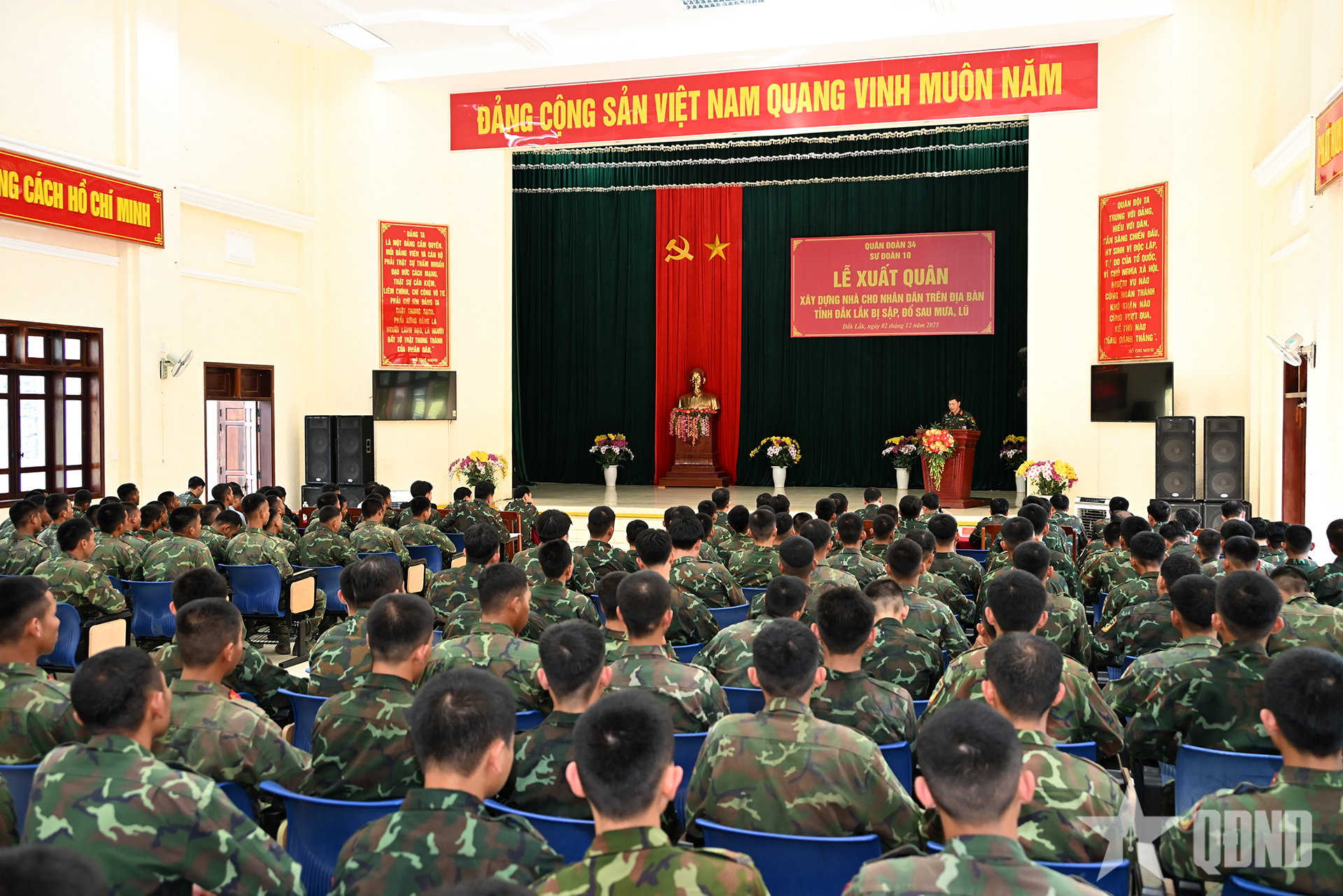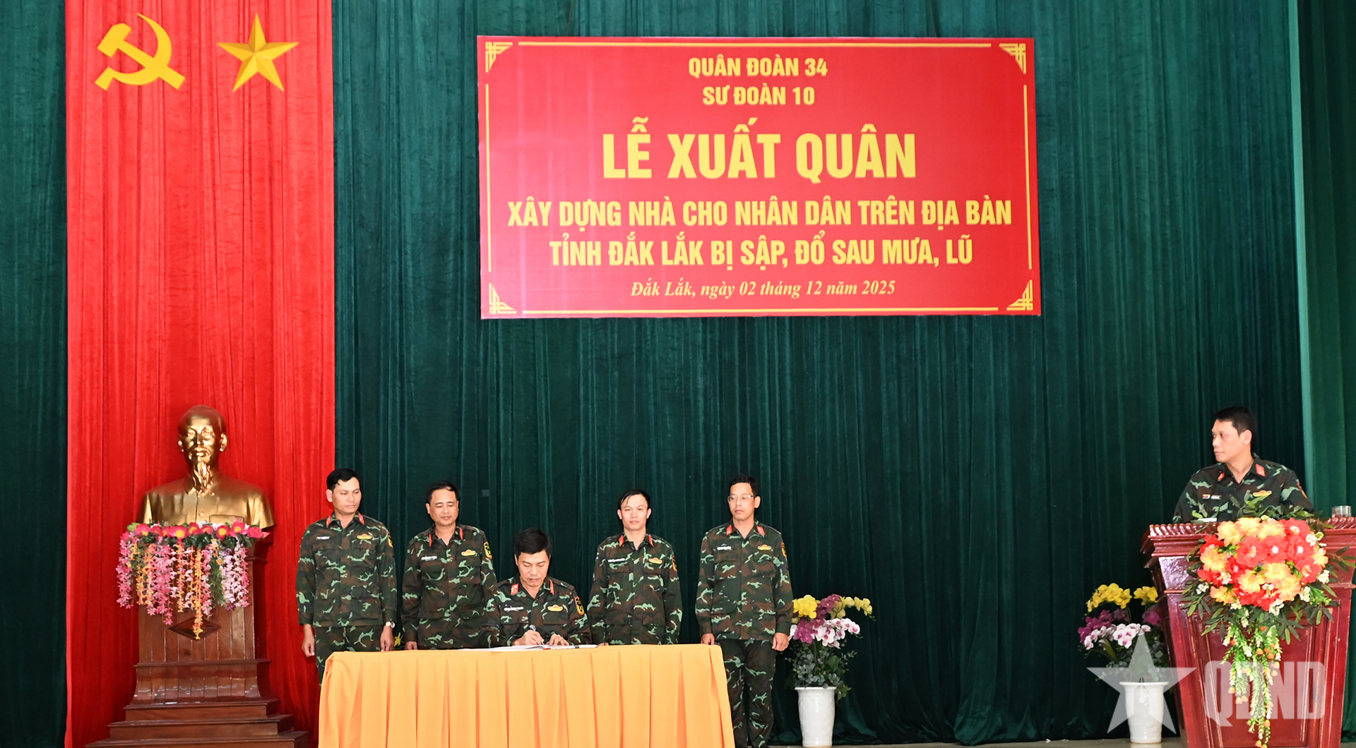 Informand și atribuind sarcini ofițerilor și soldaților la ceremonia de plecare, locotenent-colonelul Dang Thanh Tuyen, comisar politic adjunct al Diviziei 10, a declarat că, înțelegând pe deplin instrucțiunile prim-ministrului, șefului Ministerului Apărării Naționale și Comitetului permanent al Comitetului de Partid, Comandamentul Corpului 34 privind implementarea „Campaniei Quang Trung”, reconstruind și reparând rapid locuințele pentru oameni după ploi și inundații, Divizia 10 a finalizat toate pregătirile și a organizat o ceremonie solemnă de plecare în scurt timp.