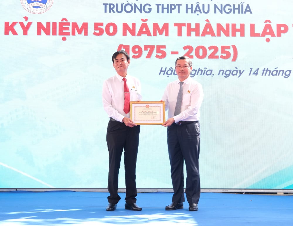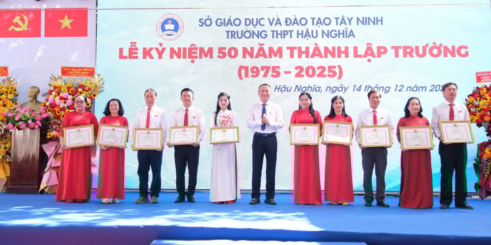 În cadrul ceremoniei, Ministrul Educației și Formării Profesionale a acordat un certificat de merit colectivului Liceului Hau Nghia; Președintele Comitetului Popular Provincial a acordat certificate de merit unui număr de 10 persoane, iar Directorul Departamentului de Educație și Formării Profesionale Tay Ninh a acordat certificate de merit unui număr de 21 de persoane pentru realizările lor remarcabile în construcția și dezvoltarea școlii cu ocazia celei de-a 50-a aniversări a acesteia.