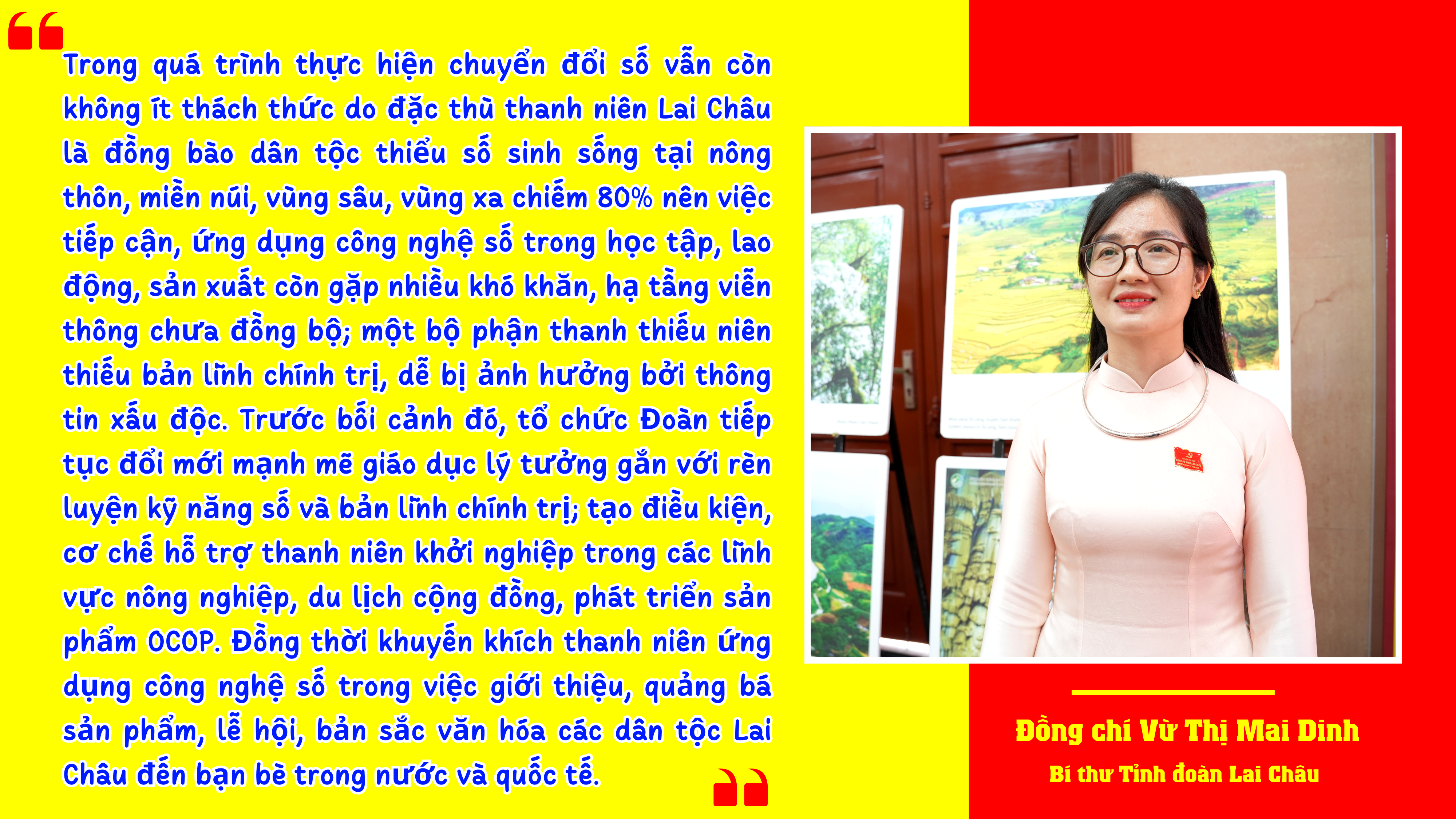 Tinerii din Lai Chau reprezintă 20% din populația provinciei, în principal tineri aparținând minorităților etnice care trăiesc în zone rurale. În ultima vreme, multe uniuni de tineret și-au promovat rolul de pionierat în conservarea și răspândirea identității culturale a grupurilor etnice și, în același timp, aplică tehnologia digitală pentru a promova și introduce produse agricole din Lai Chau către clienții din interiorul și din afara provinciei. Exemple tipice includ: Cooperativa de Tineret Sin Chai (model antic de ceai), Grupul de Tineret pentru Dezvoltare Economică Ban Lang (model de cultivare și procesare a produselor din banane), Cooperativa de Tineret Hua Na (model de cultivare a căpșunilor și strugurilor negri), Cooperativa Thanh Xuan (model de apicultură și procesare a produselor din miere).